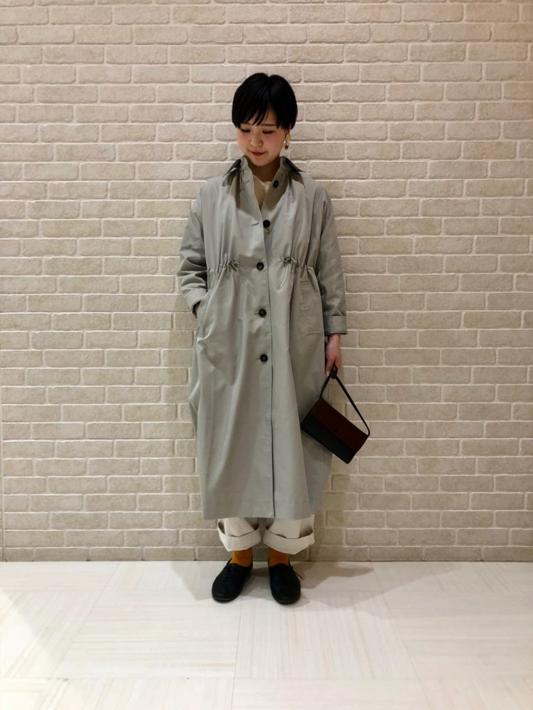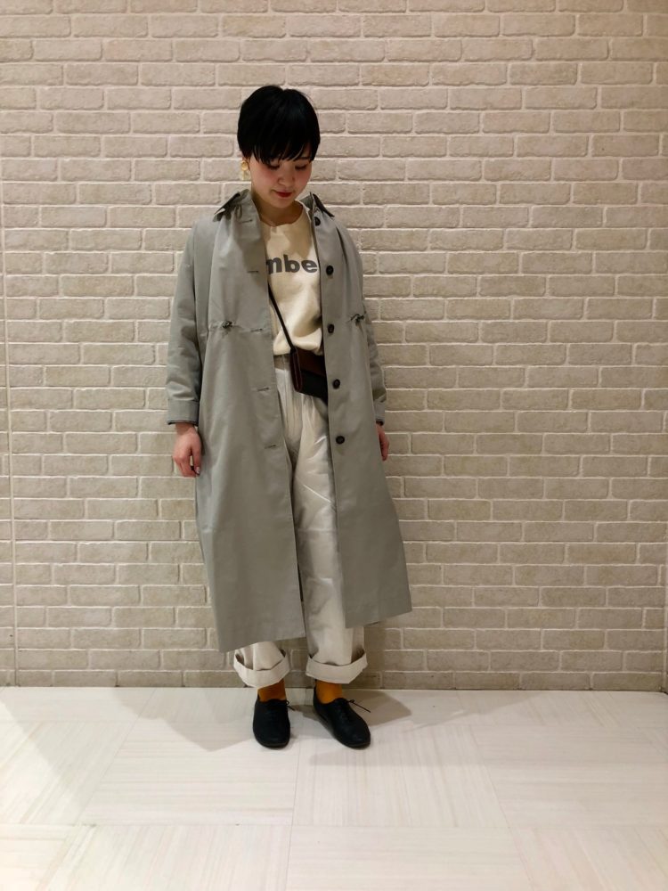 太すぎないパンツに、大きめの襟が魅力のステンカラーコートをプラスして落ち着いたイメージに。