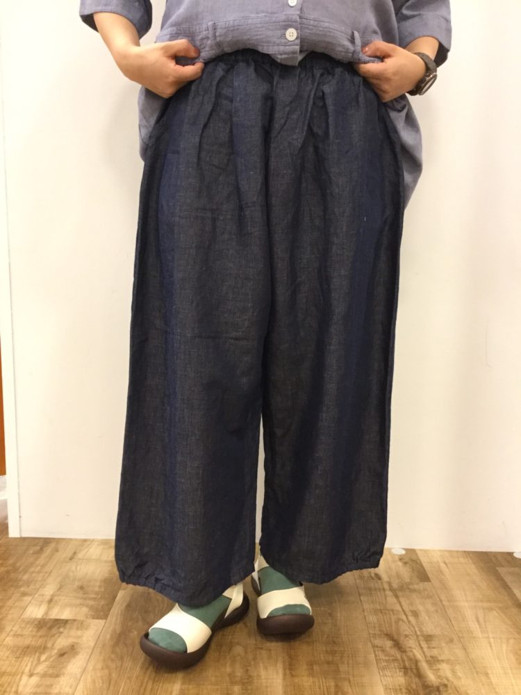 ボトムは薄手ながらも少しハリ感のある、綿麻特有のドライ感とシャリ感が感じられる大人のナチュラルパンツ。