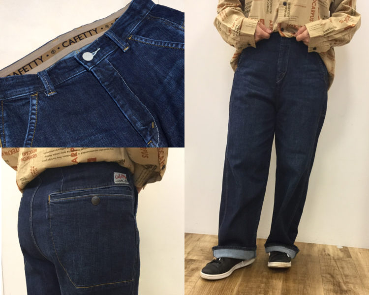 Cafettyの定番で使っているストリィキングストレッチデニムを使用した、ワイドストレートパンツ。