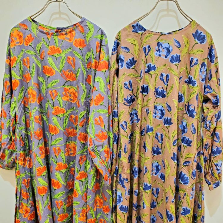 ▼ライトボイルフラワープリント脇フレア切替クルーワンピ