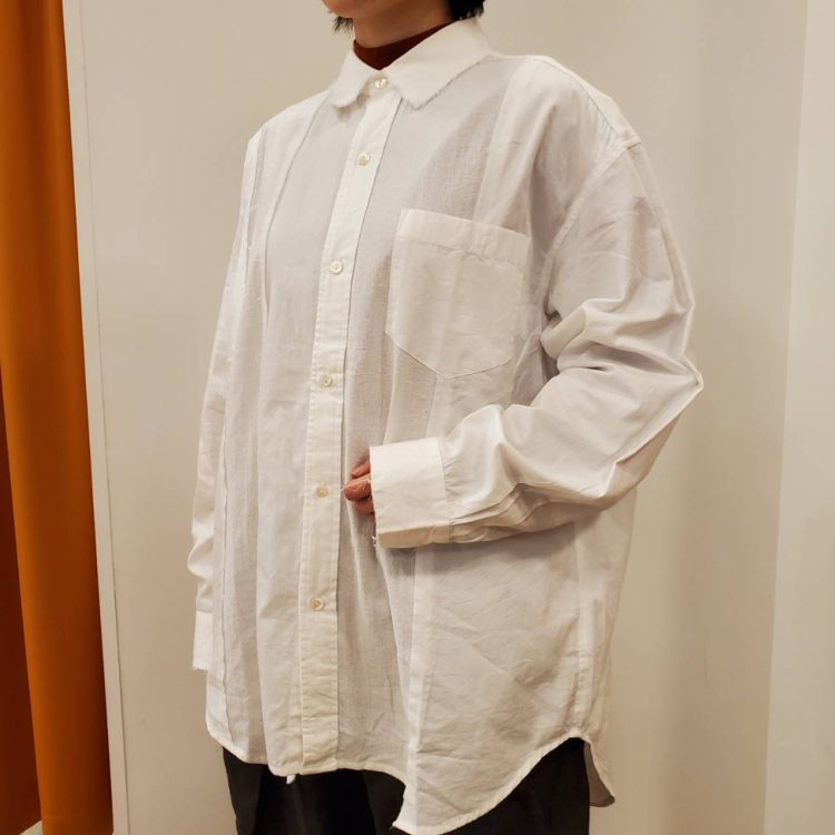 シンプルなシャツに見えますが、2種類の生地を組み合わせたリメイクシャツです。