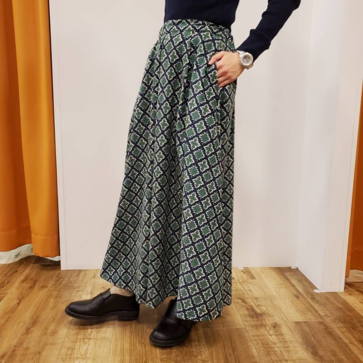 少し光沢がある生地なので、カジュアルすぎない、上品なコーデに仕上がります。