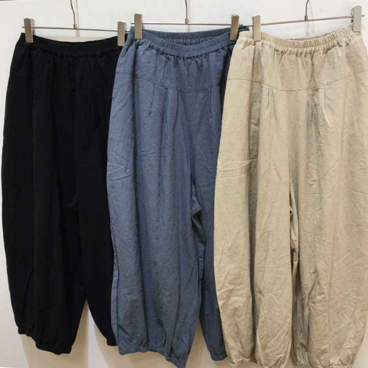 ▼綿麻平織起毛ヨーク切替裾ギャザーパンツ