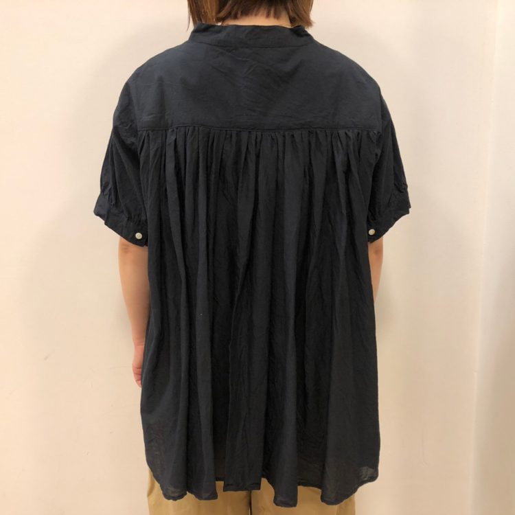 前身頃には程よくハリのあるポプリン生地を、後ろ身頃はシアー感のある軽やかなボイル生地で切り替えたドッキングデザインのシャツ。