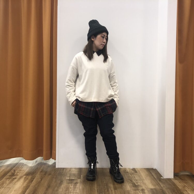 アウターがボリューム感があるのでスッキリ見えるように細めのパンツを着用。