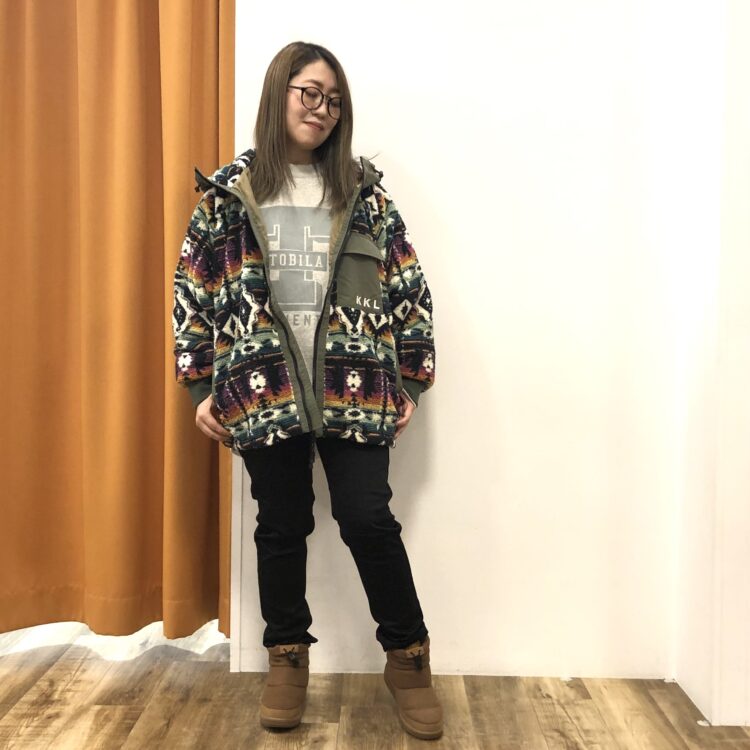 幾何学模様がかっこいいフリースボアブルゾン。裏地付きで腕の通りもスムーズでとっても軽いんです!!