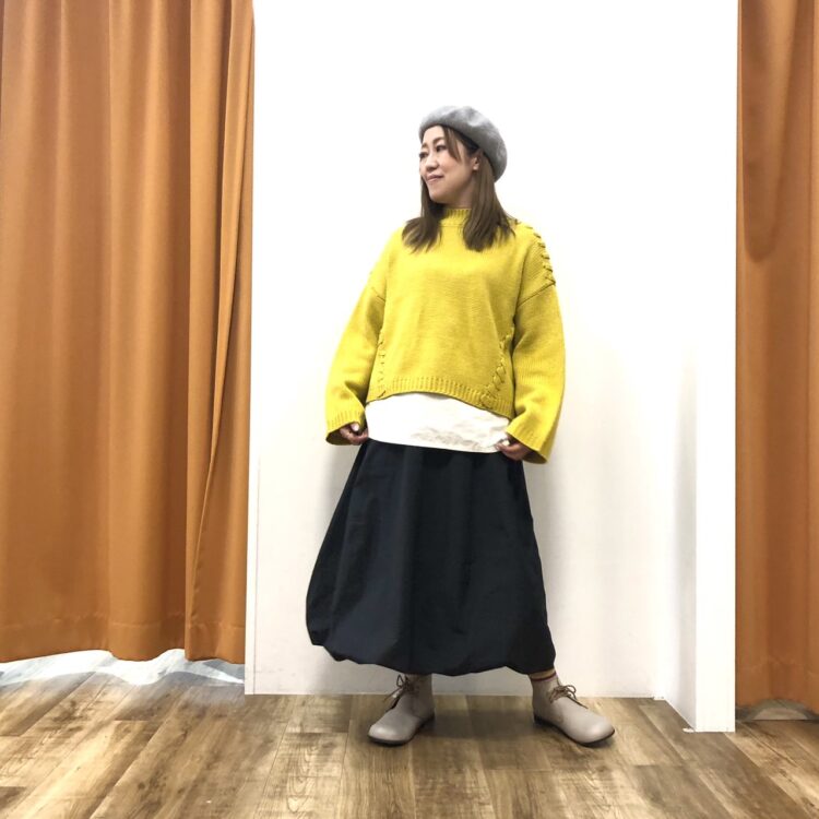 少し短めの丈なのでレイヤードして長さをプラス。スカートのブラックカラーの間にワンクッションを入れてみました!