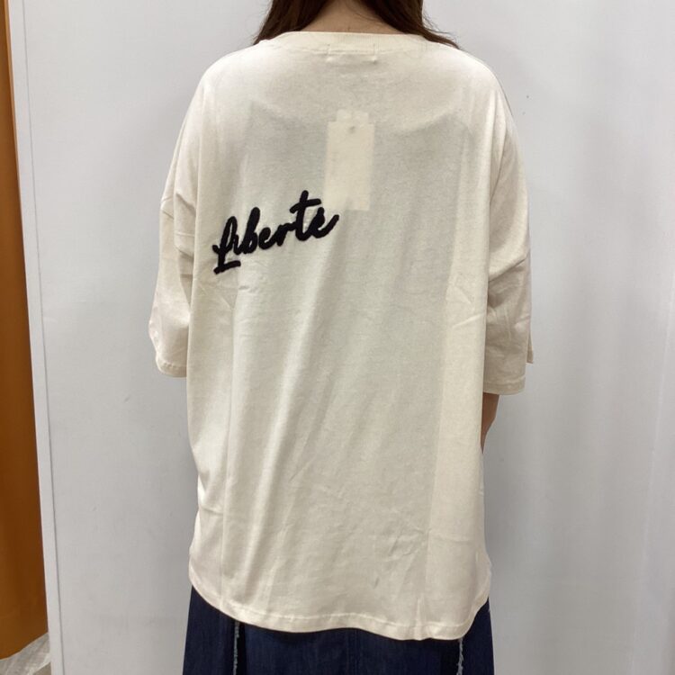 立体感ある英字ロゴプリントが前後に施されている、ロング丈Tシャツ。