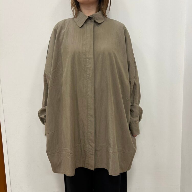 アウトドアウェアのようなシャリ感と微光沢がポイントのビッグシルエットシャツ。