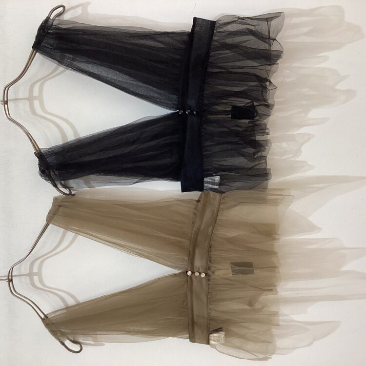 シンプルなトップスに合わせえるだけで華やかになるチュールビスチェ。