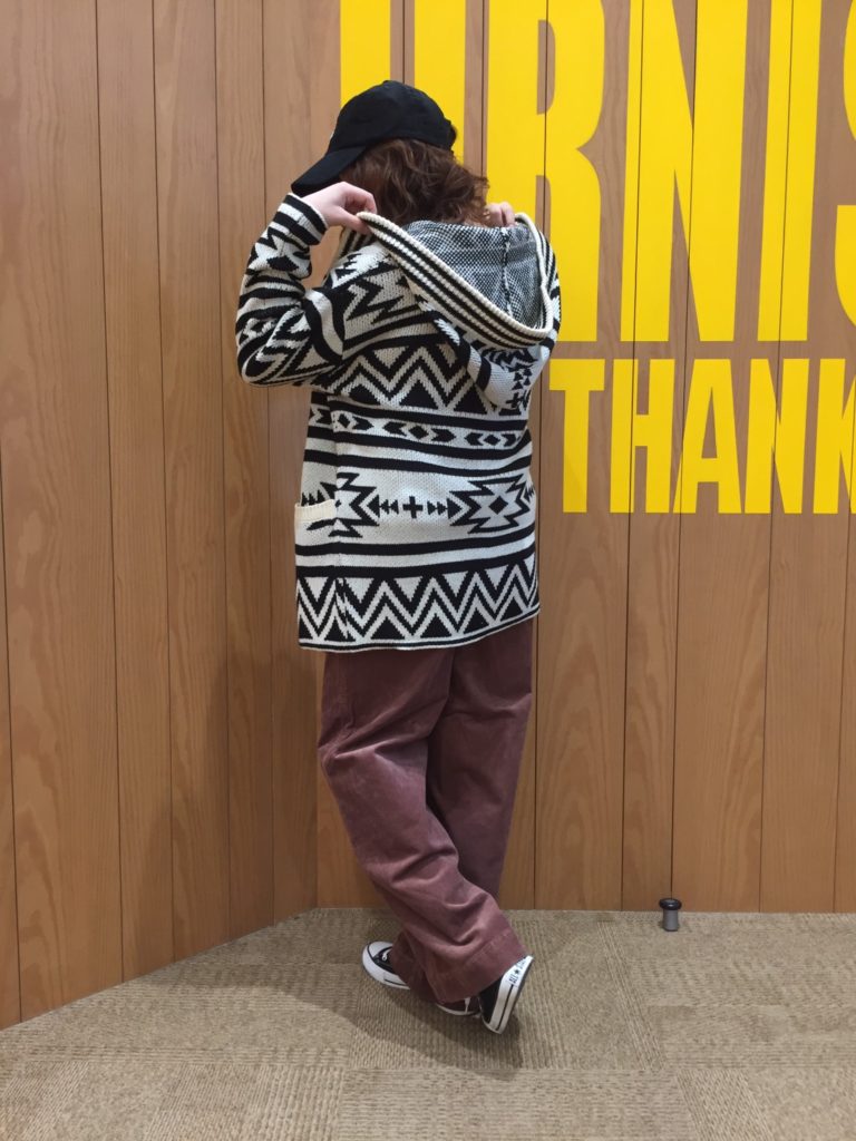 総柄ニットカーデを主役に、コーデュロイ素材のパンツでトレンドも取り入れたカジュアルコーデにしてみました♪