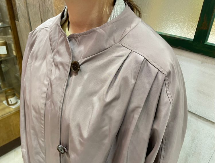 光沢感があり、少しメンズライクなロング丈のナイロンコート。