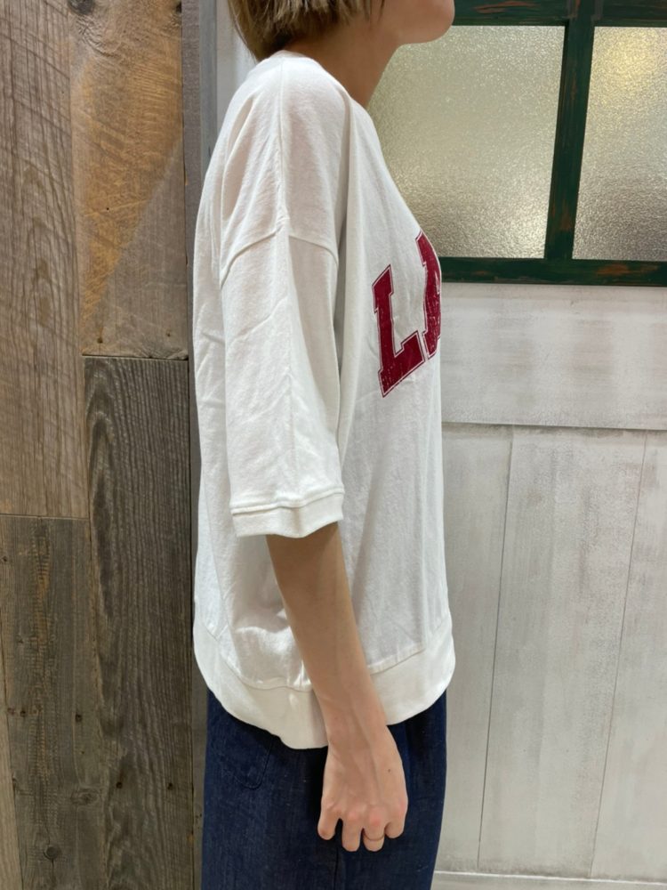 大きなロゴが入ったビッグシルエットのTシャツ。