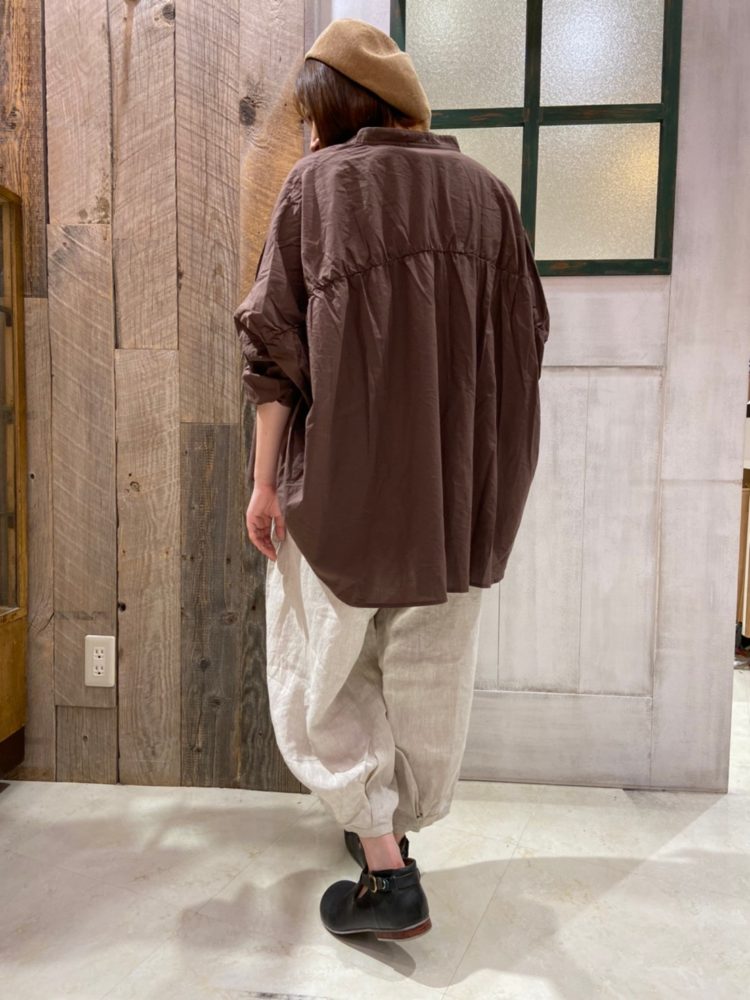 フロントはスッキリとシンプルに、バックにはたっぷりとギャザーが入っていてアクセントのあるブラウスです。