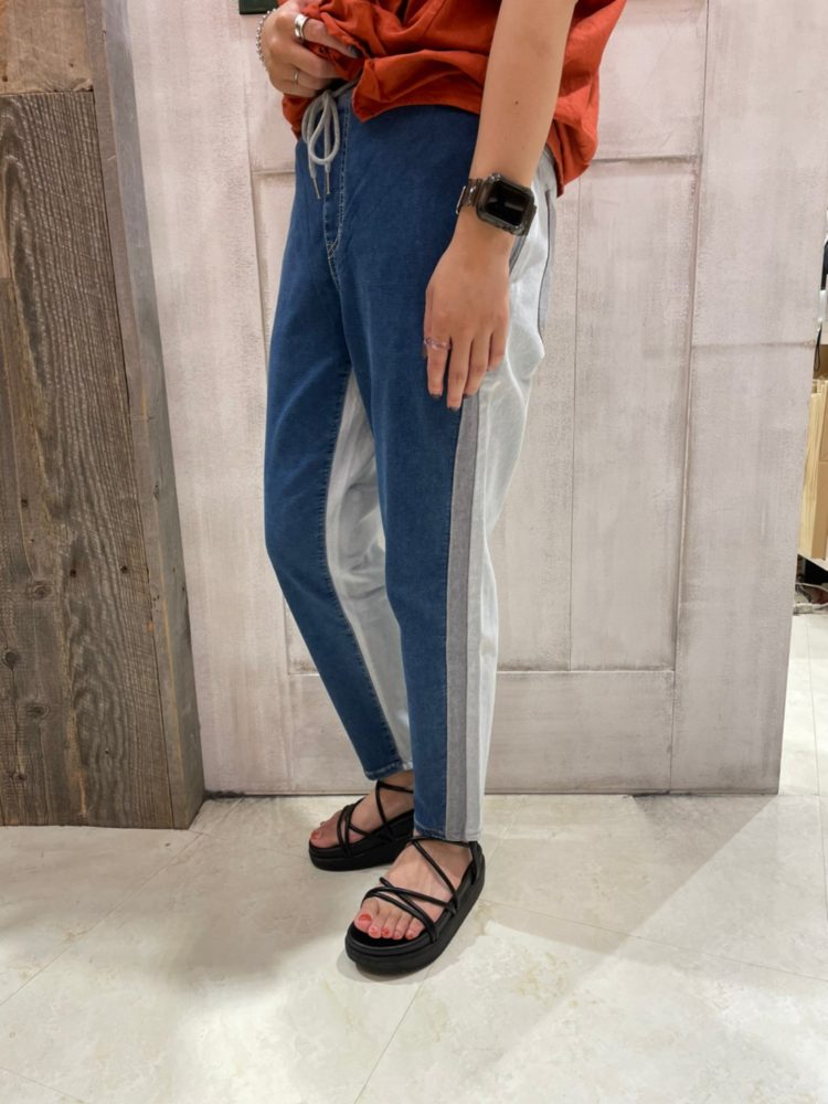 フロントは、穿き心地の良いストレッチ素材のカットデニムと、バックは白いウェットとのドッキングデザインになっています。グレーのサイドラインとバックポケットで、スポーティーな雰囲気に。