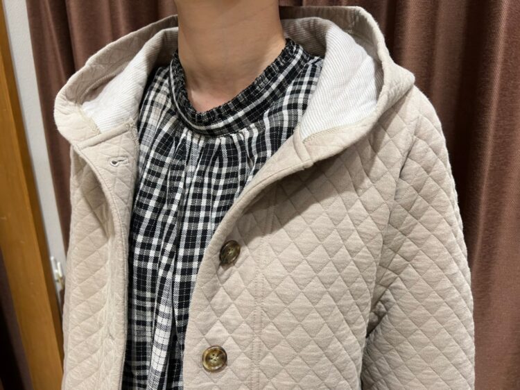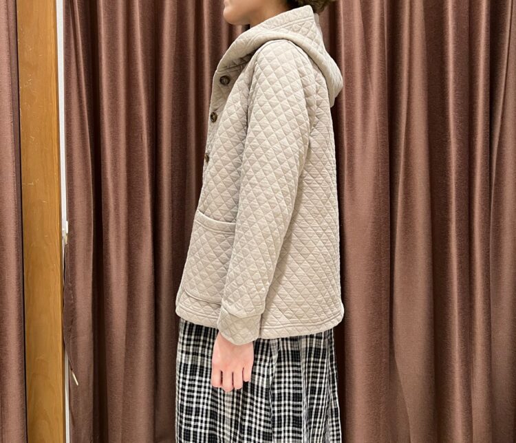 中綿の入ったキルティングですが、薄くて軽いのでさっと羽織るのに便利です◎