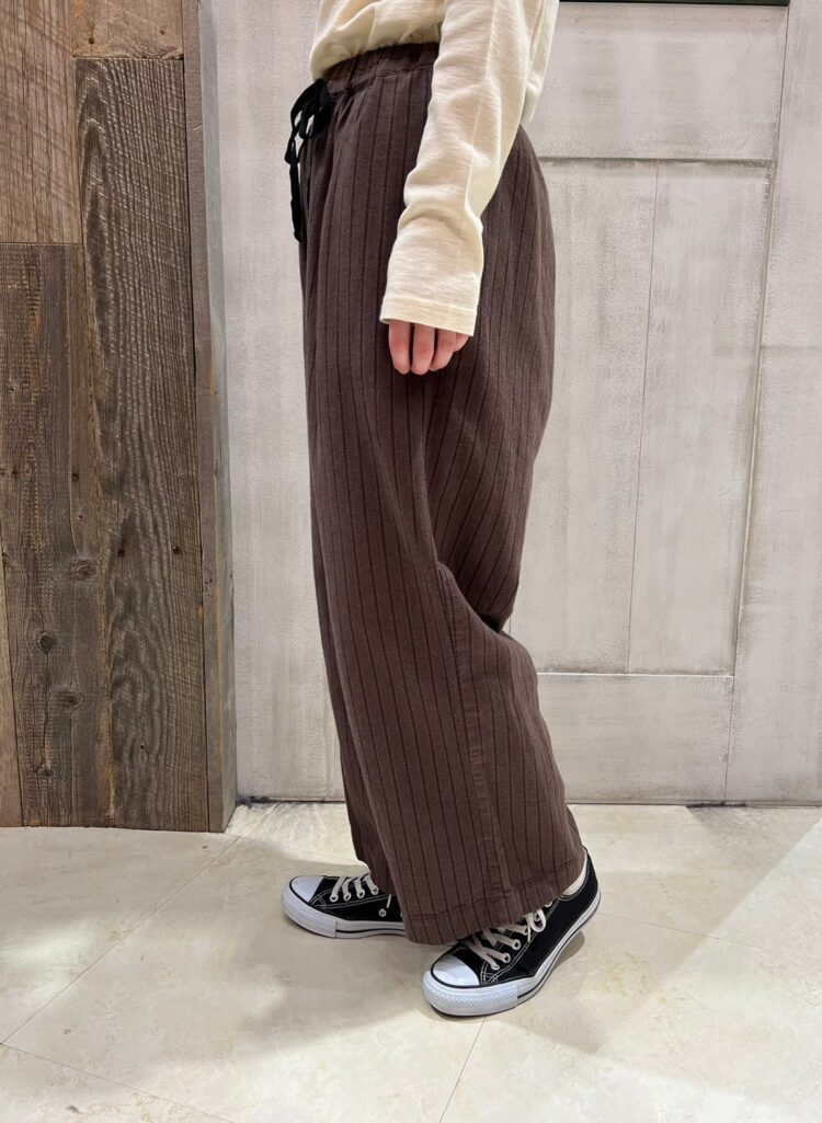 トップスはベージュ系にしたので、ボトムは濃いブラウンのストライプ織が可愛いイージーパンツを合わせました。