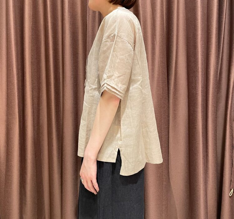 フロントと袖口にピンタックの入った綿麻ブラウス。
