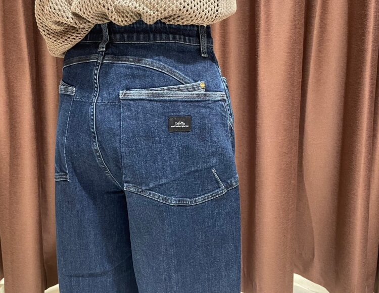 裾にかけてカーブラインで絞ったコクーンシルエットのデニム。
