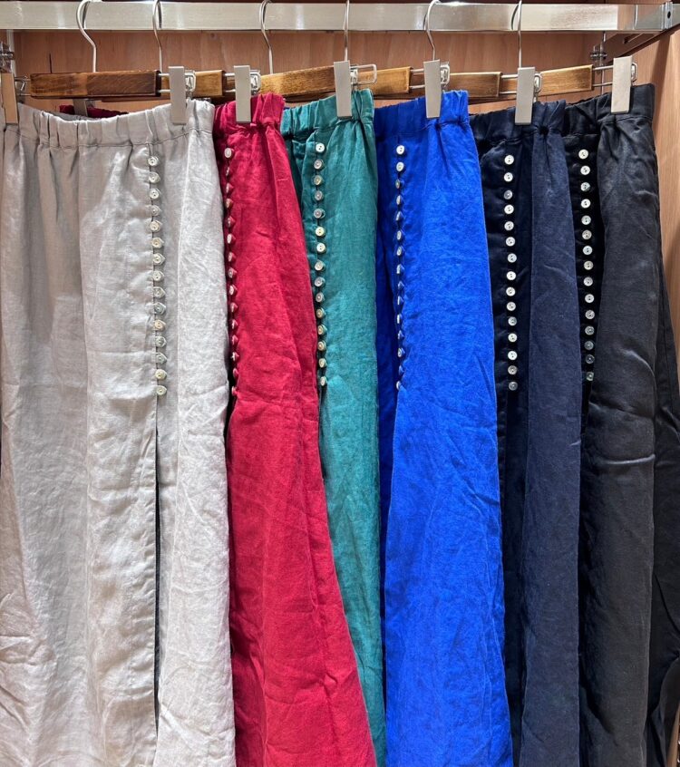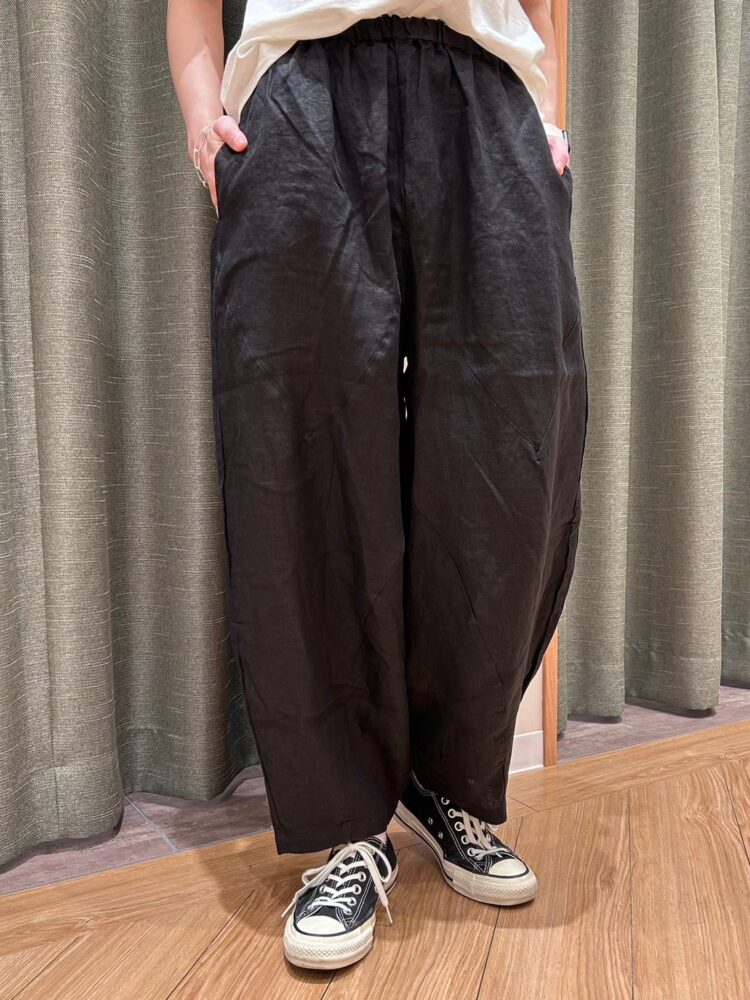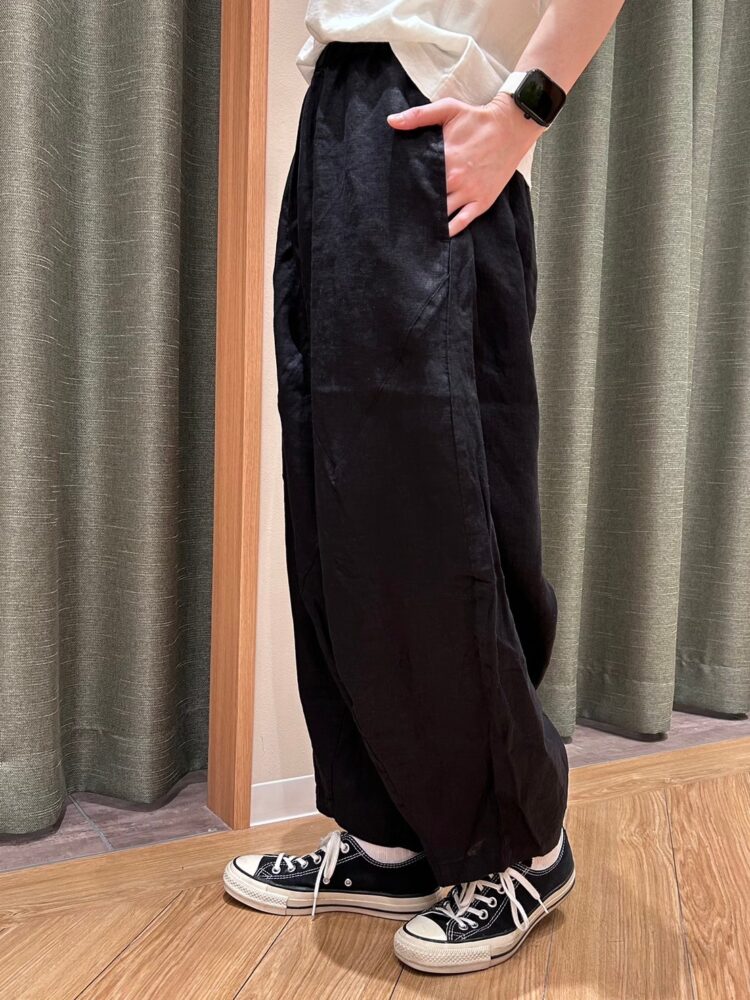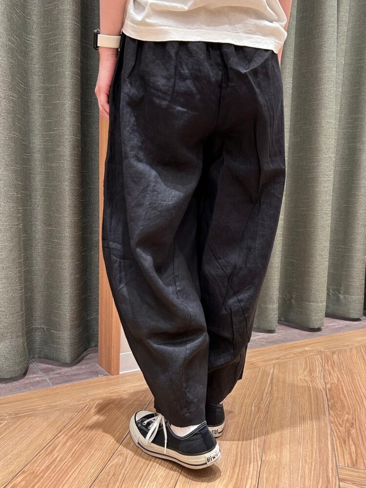 シャリ感はありつつ滑らかな手触りが特徴の14番手リネンのパンツ。