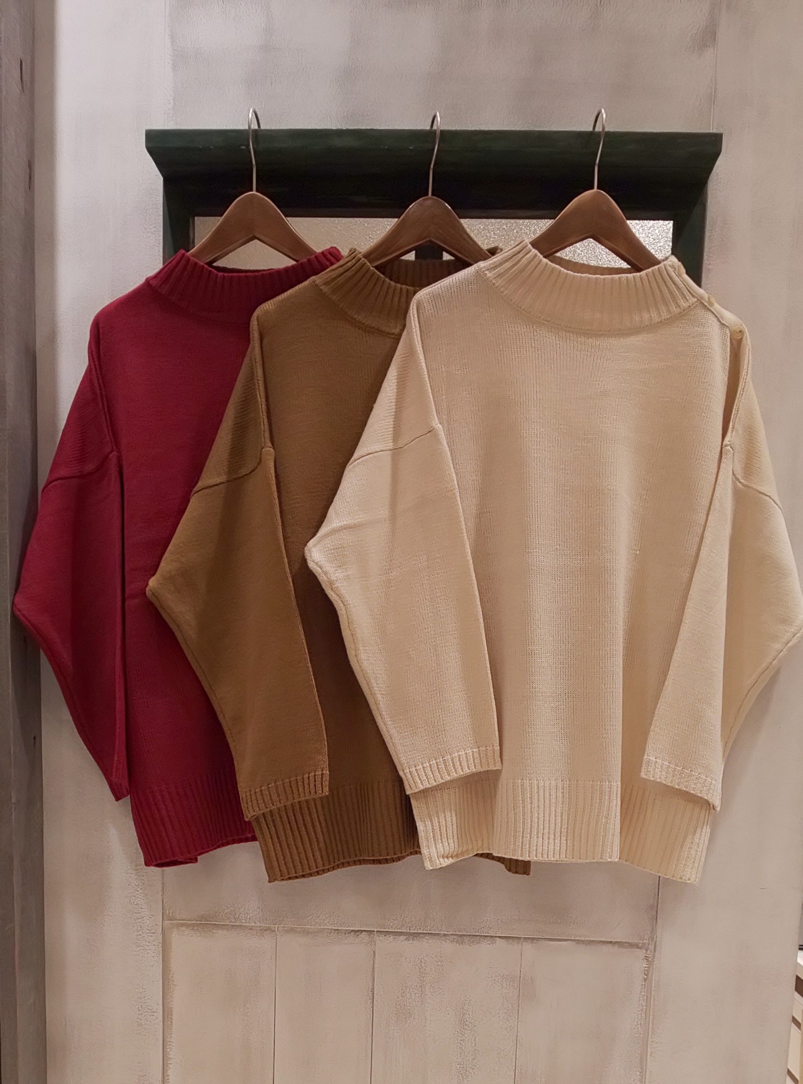 首元のボタンがポイントのハイネックニットは色違いでのお買い上げも多い人気アイテム。