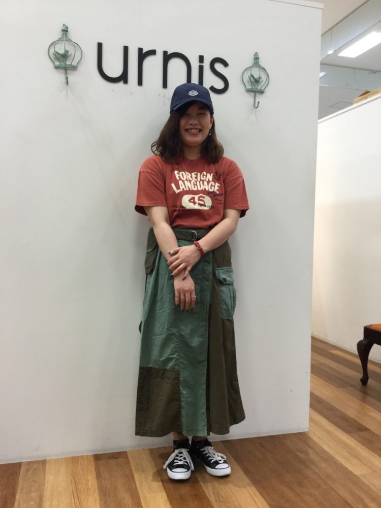 スモーキーなオレンジのトップスに、ミリタリーの要素たっぷりなスカートを合わせたひと味違うカジュアルスタイルに合わせてみました。