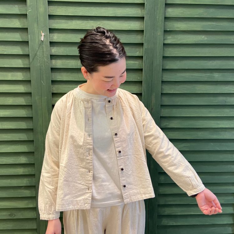 綿麻平織起毛長袖ギャザーブラウス