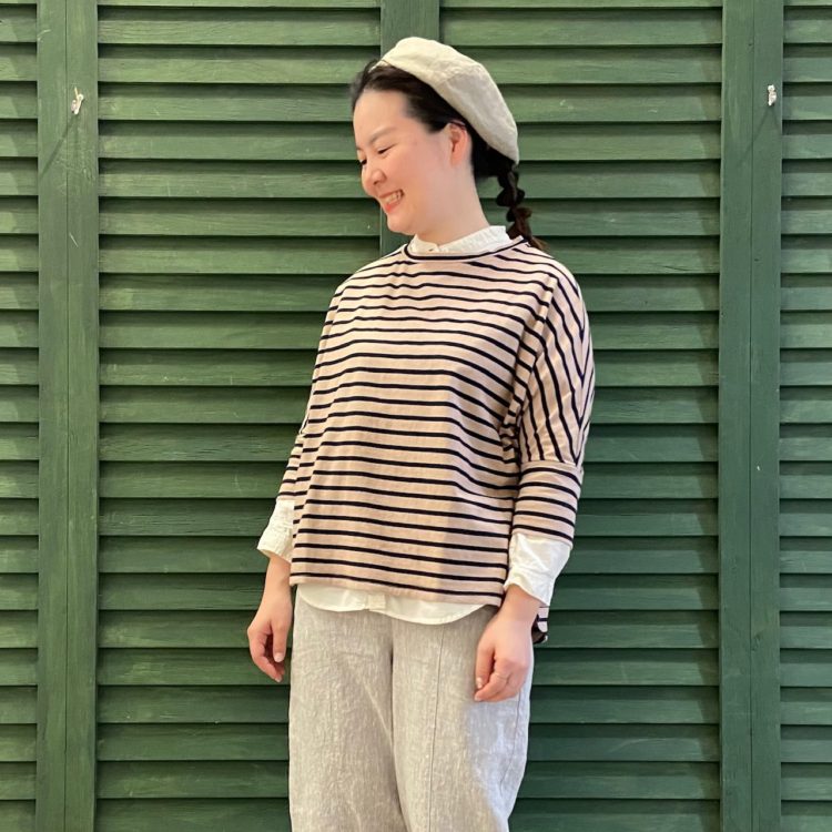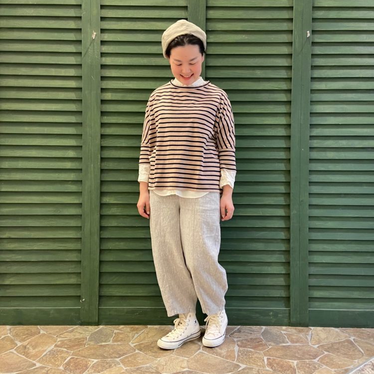 春はブラウスや長袖のカットソーを重ね着して、夏は半袖のTシャツまたはサラサラの薄いカーデを合わせるのがオススメです。