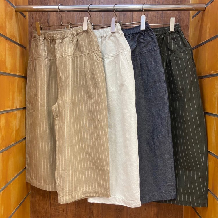 綿麻オックスシャンブレーストライプ切替タックパンツ