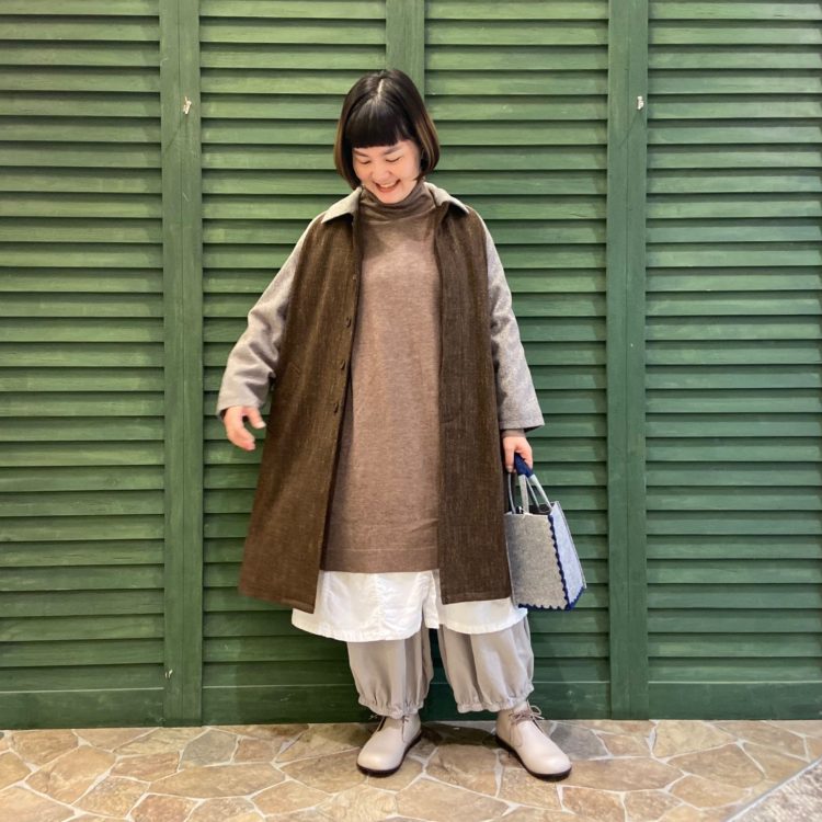前身頃の方が丈が少し短めなので、小柄な方ならタイツやレギンスを合わせてワンピースとしてちょうどいい着丈です