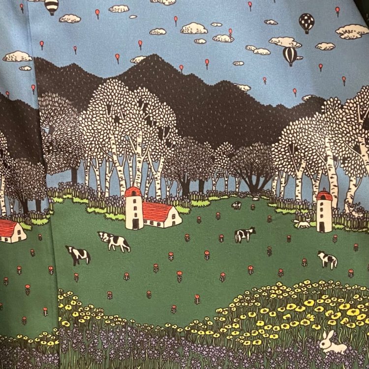 中に合わせたワンピースはパッチワークのように何枚もの生地を合わせたデザインが可愛い1着