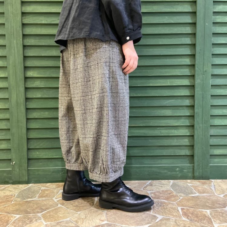 綿麻平織起毛千鳥グレンチェック裾ギャザーパンツ