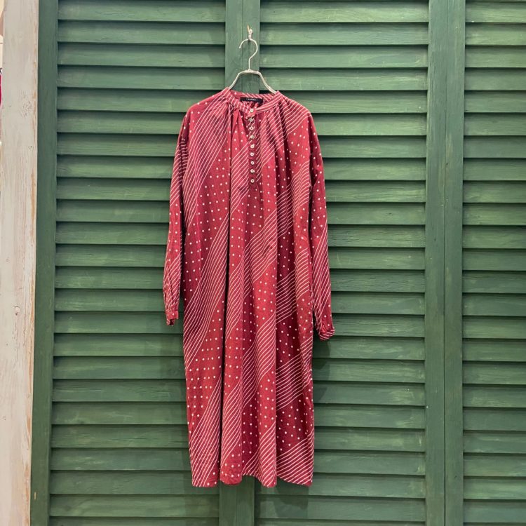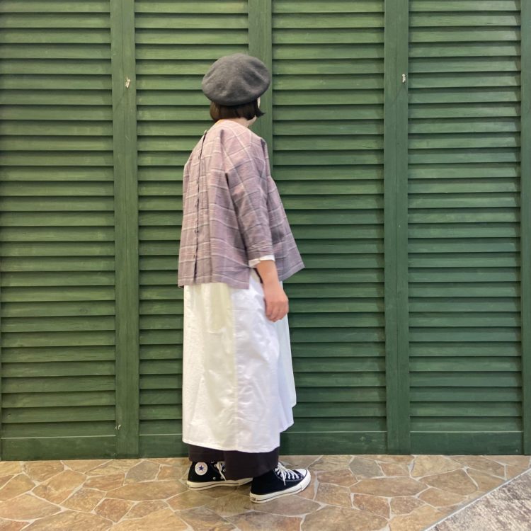 中に着ているワンピースはドットとストライプをかけ合わせた柄がポイント