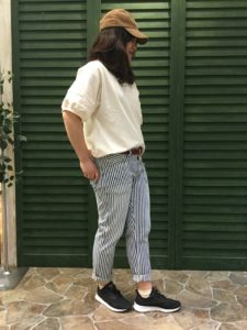Cafettyのボトムスは、定番ペグトップ。夏に出ていたものよりもさらに太めのストライプ。←この太さが今年注目!