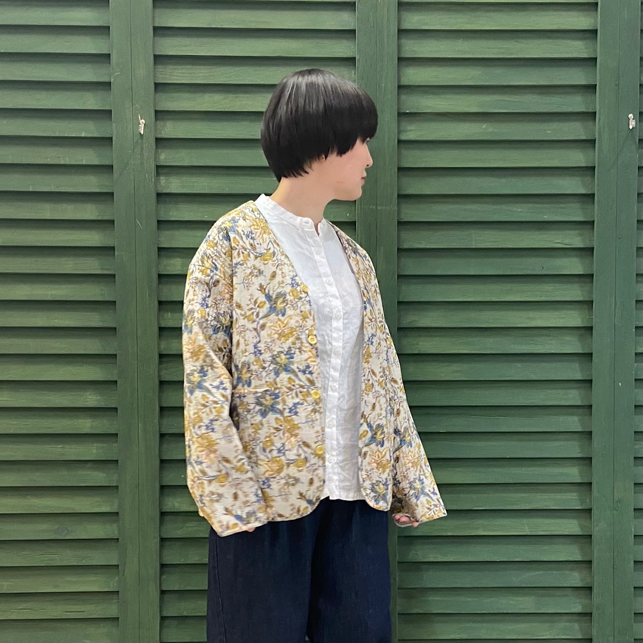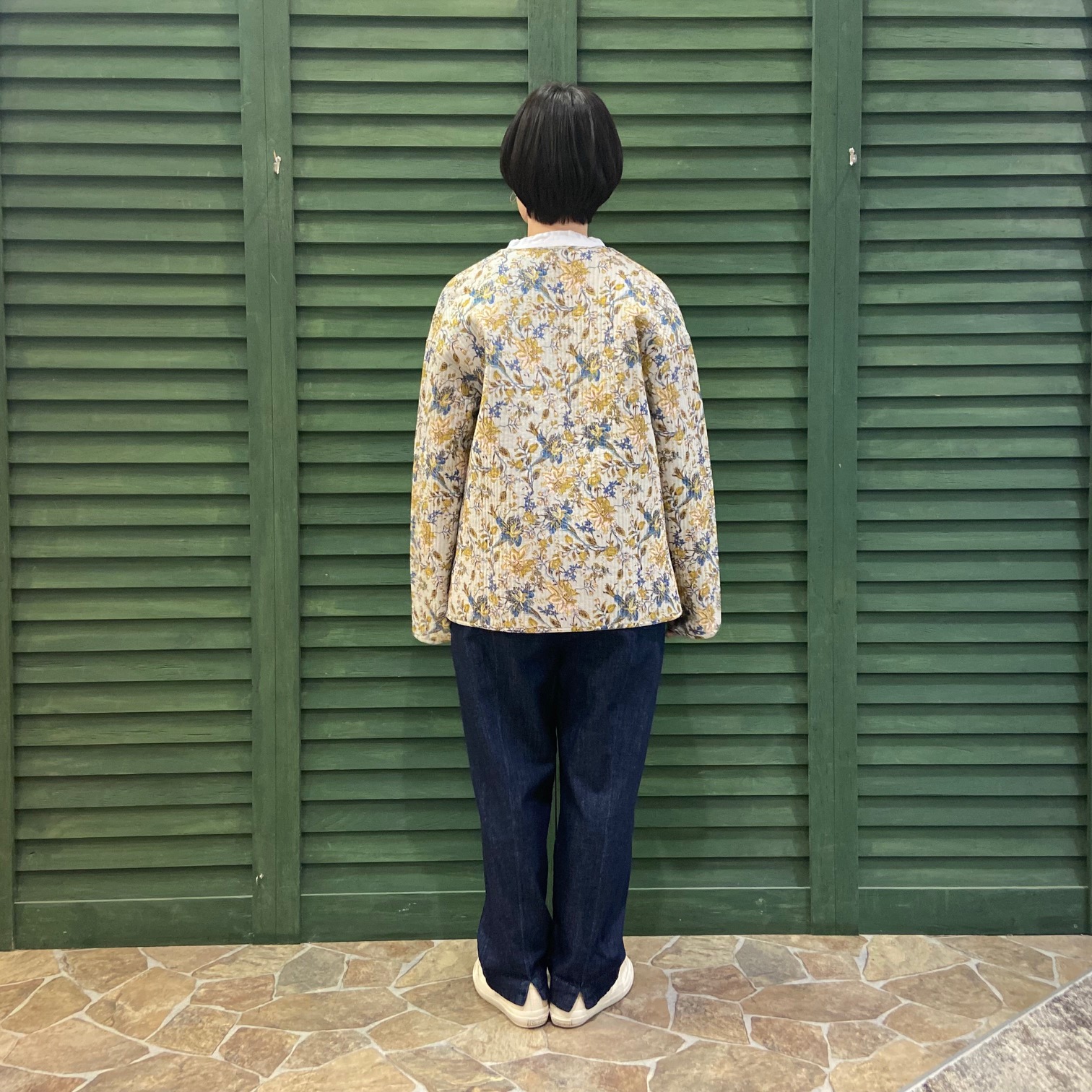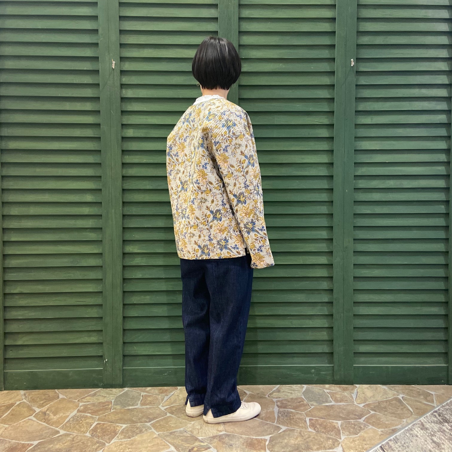 白シャツ×デニムのシンプルコーデにjohnbullの花柄ジャケットを合わせました
