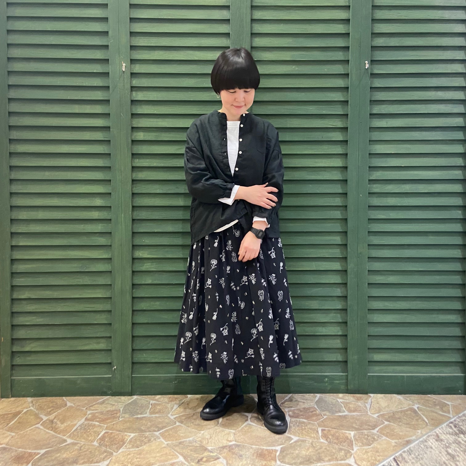 少しだけ畏まったシーンでも着られるようにtukuroiの刺繍スカートを合わせました