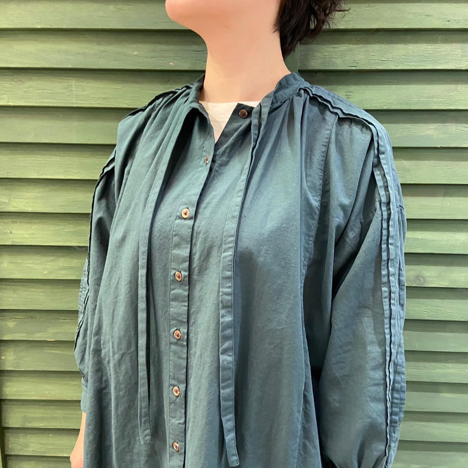秋らしいとても深いグリーンの綿麻のワンピースが入荷してます