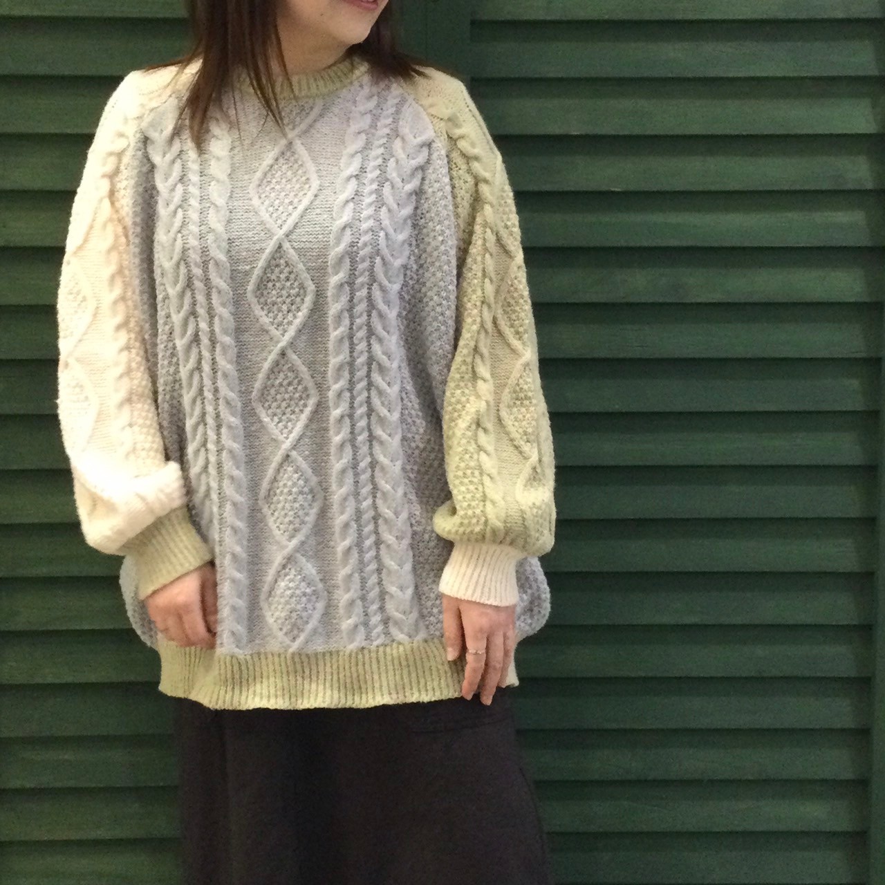 ケーブル編みニットラグランワイドクルー