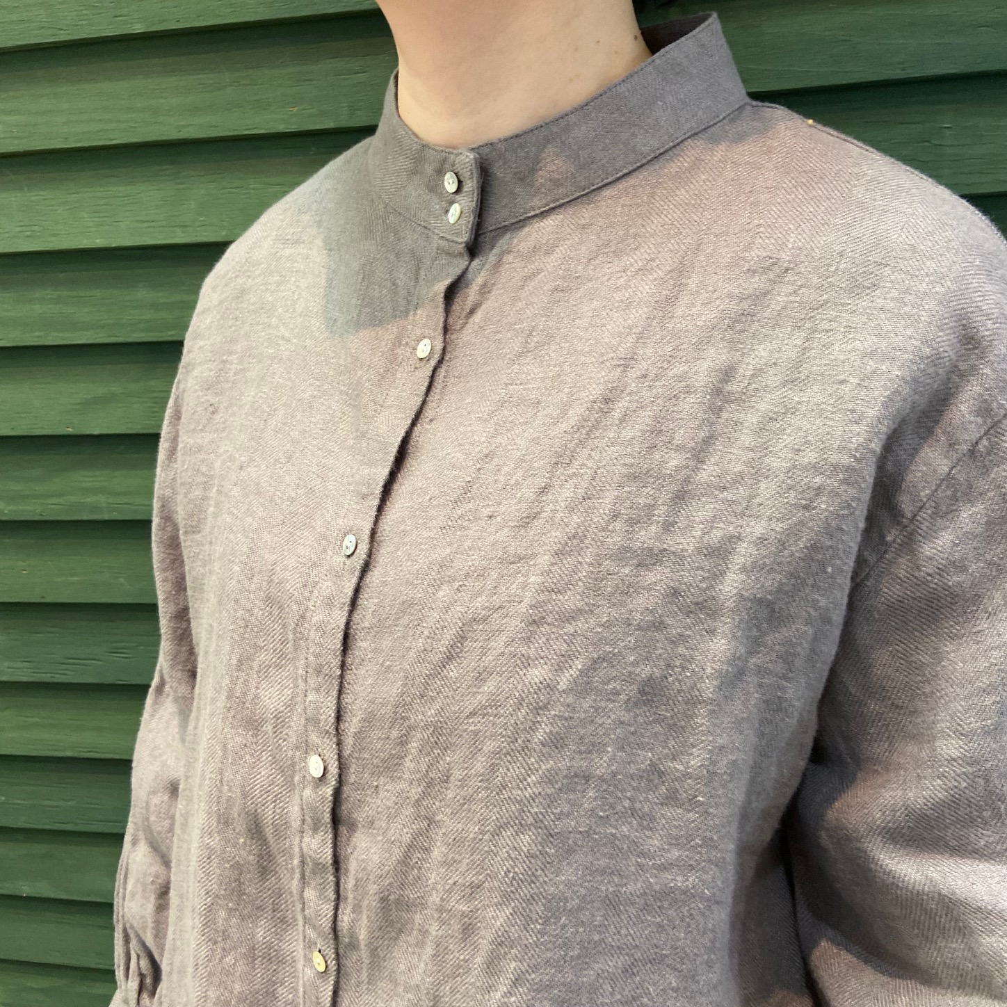 9番手へリンボーンスタンド襟ボリューム袖ブラウス