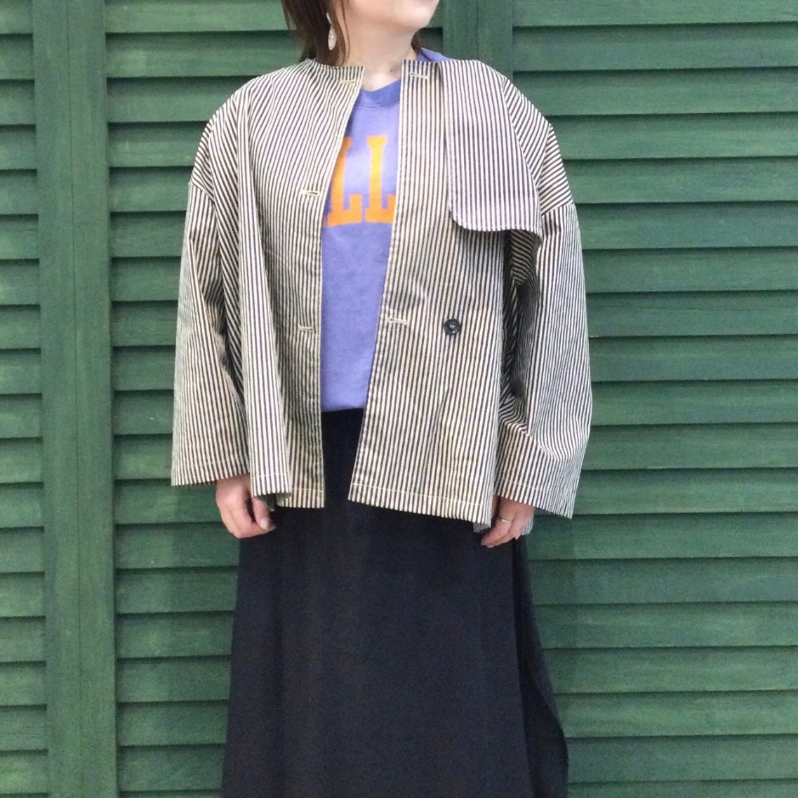 ノーカラーラウンドネックデザインなので、シャツやブラウン、Tシャツ等いろんなトップスとの相性がよく、フェイス周りをスッキリ見えに◎