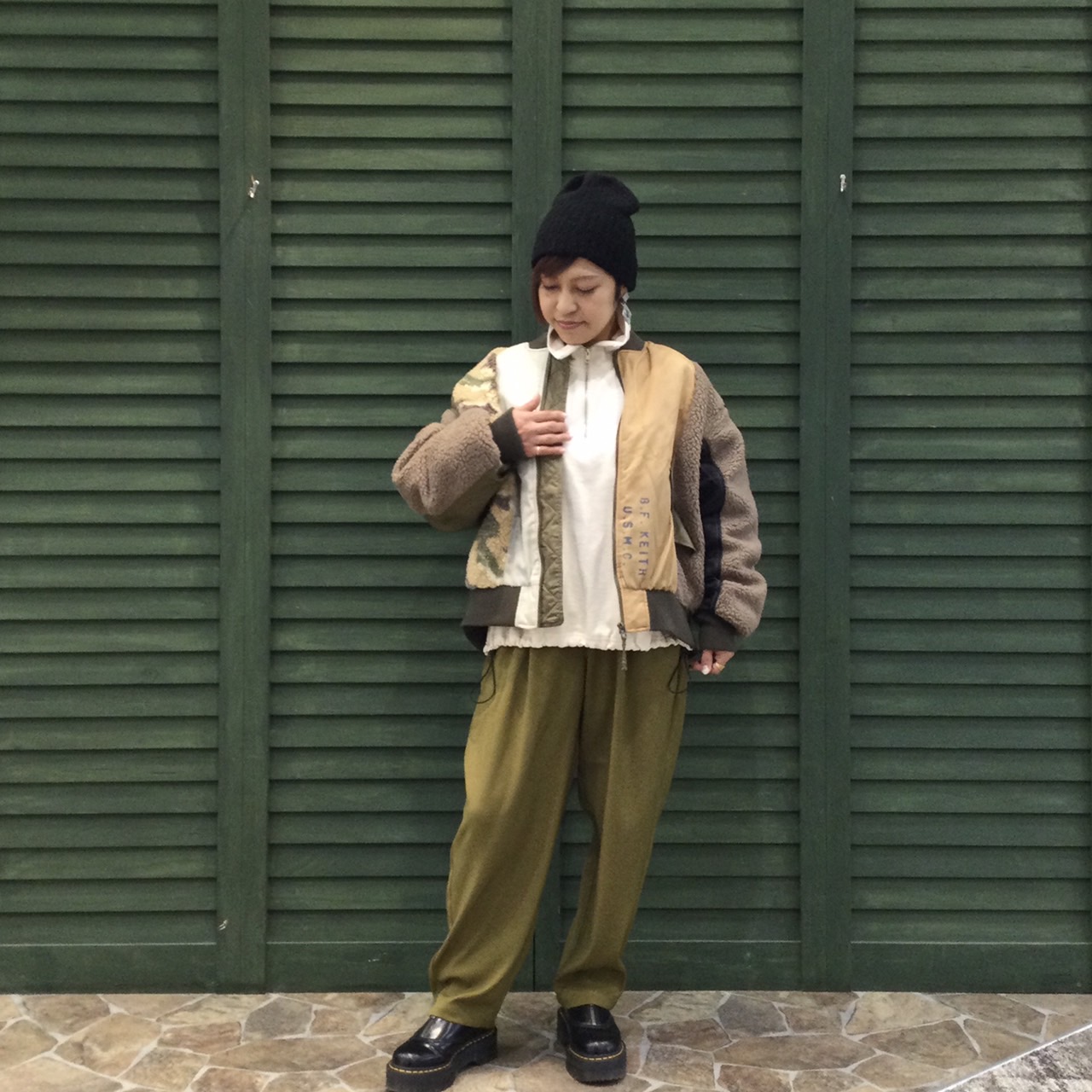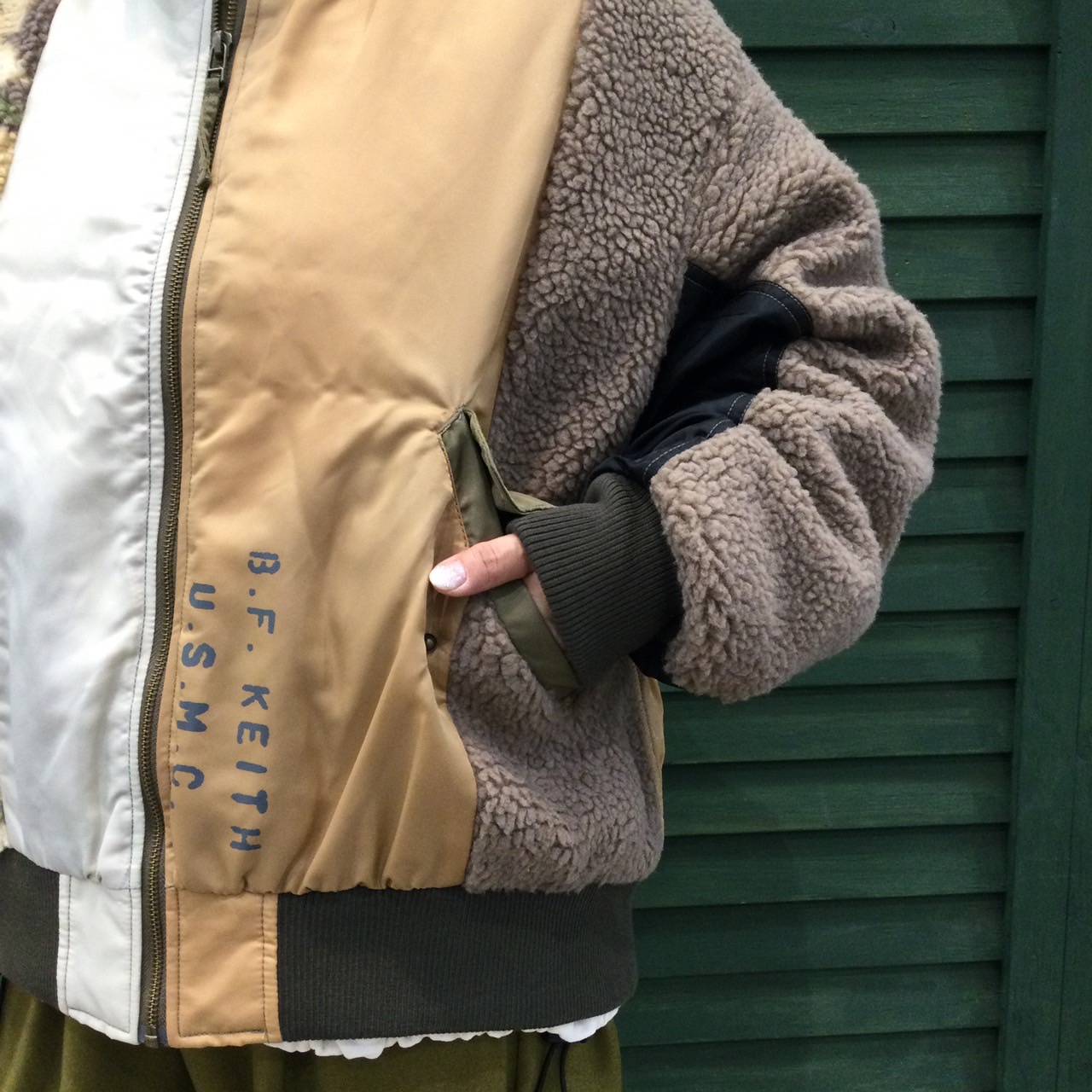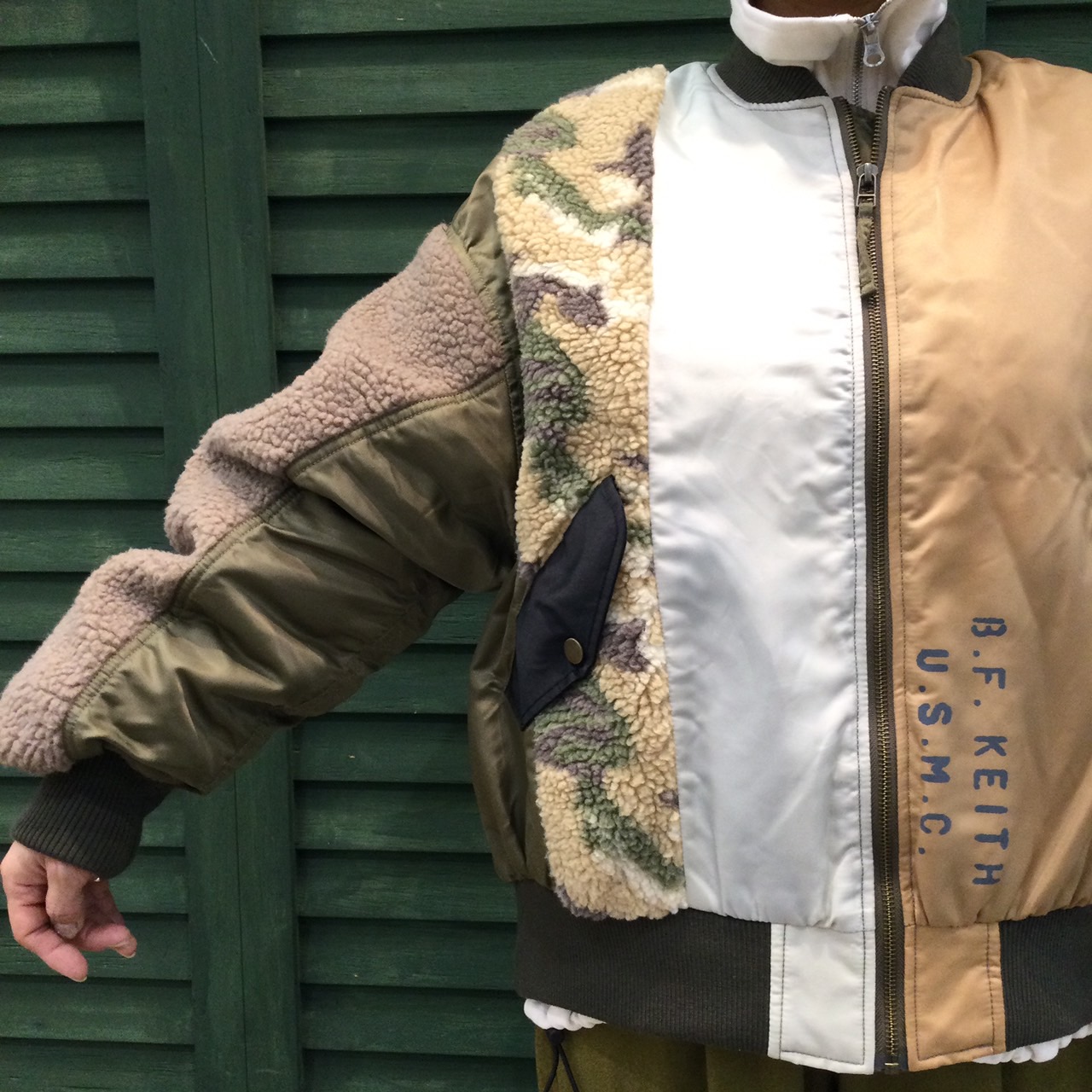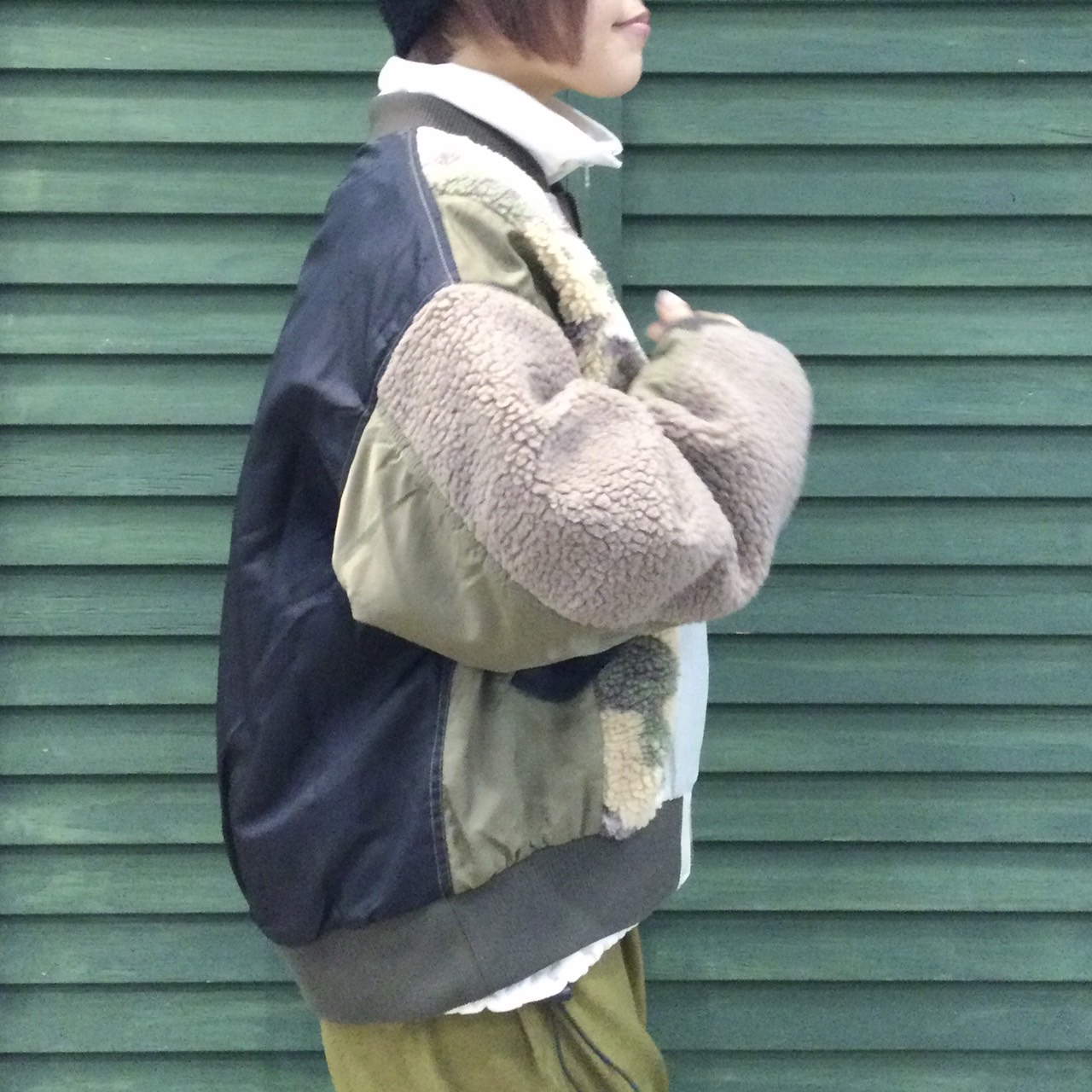 迷彩柄ボアの切替や刺繍等、リメイク風のブルゾンが主役級の存在感!