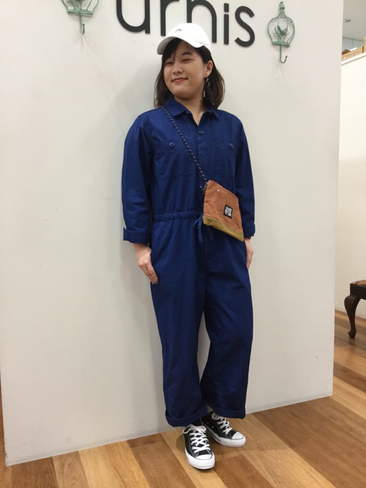 鮮やかな青色が目を惹く、オールインワン。
