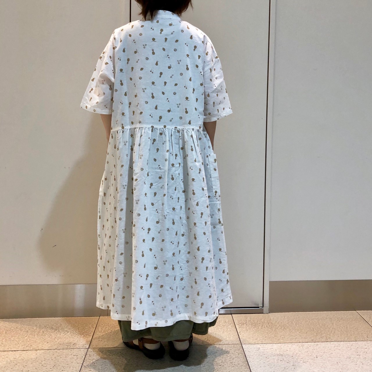 ノースリーのワンピに五分丈袖のシャツワンピを羽織り、さりげない柄が効いたシンプルなコーディネートに。