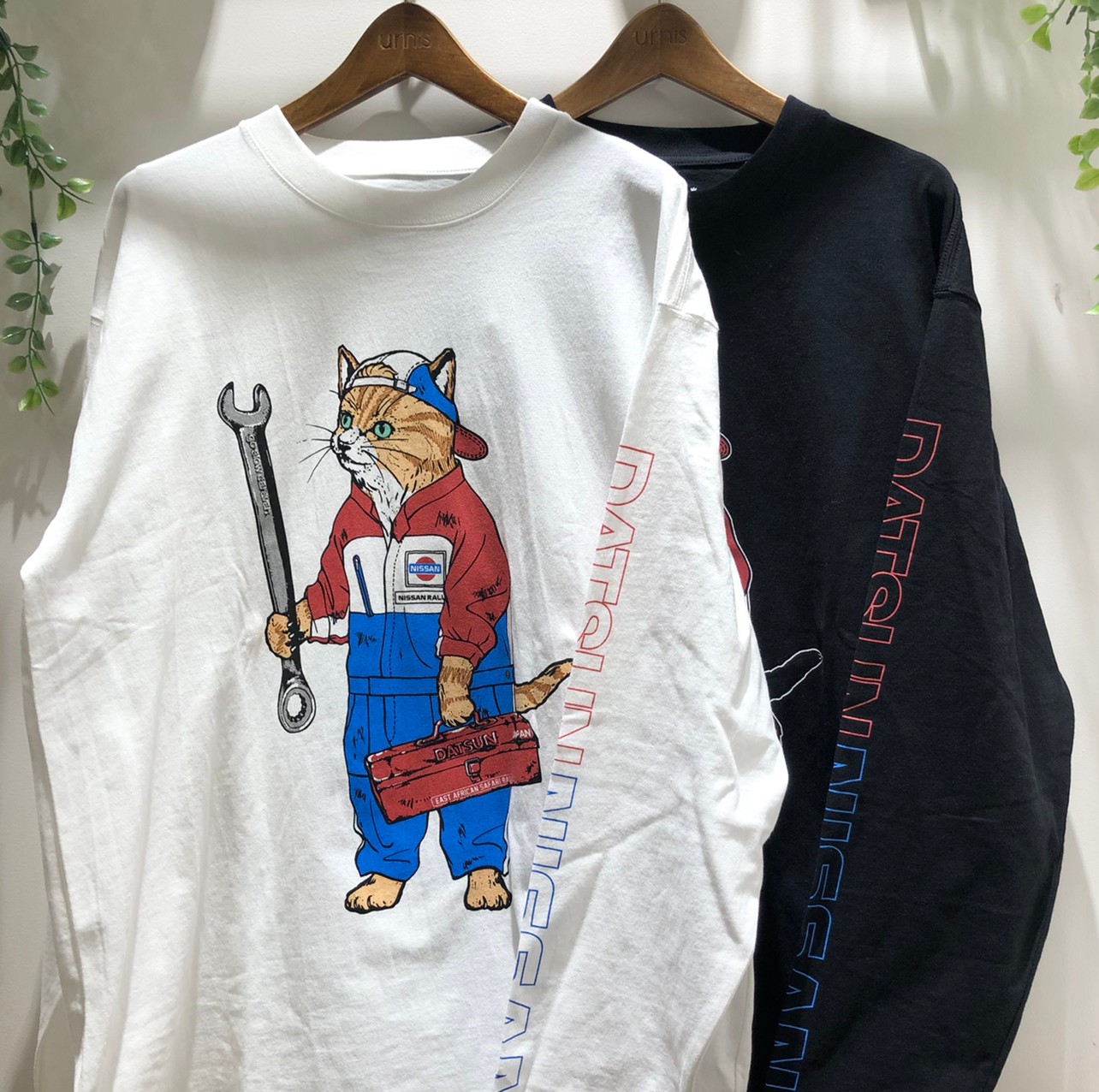 ラリー参戦時代のメカニックスーツを身に纏ったゴースローキャラバンの猫を前後に、袖にはNISSANとDATSUNのロゴをプリント。