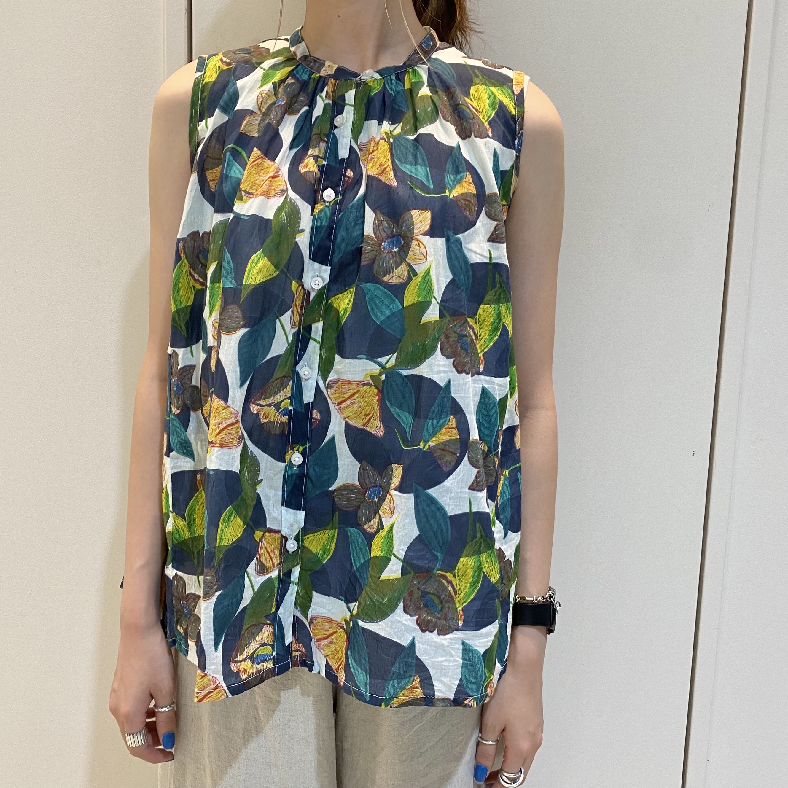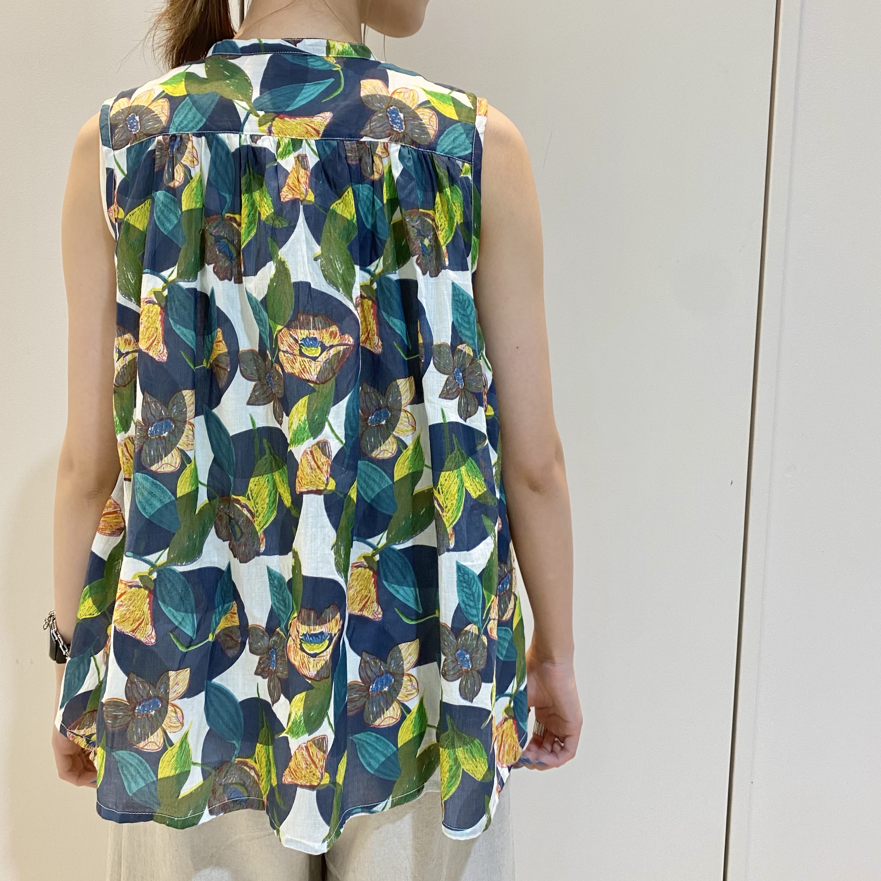 ◼️リゾートプリント衿ぐり&アームギャザーノースリブラウス