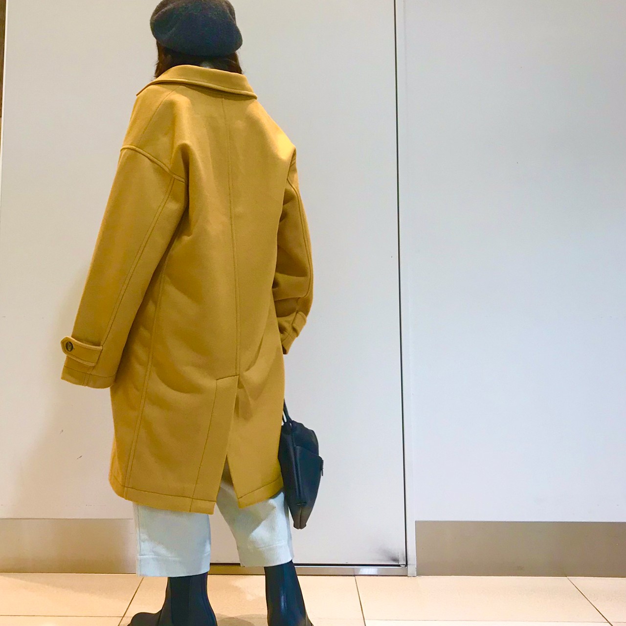 トップスとボトムをワントーンで統一したコーデに差し色コートを羽織って大人カジュアルなスタイルに。