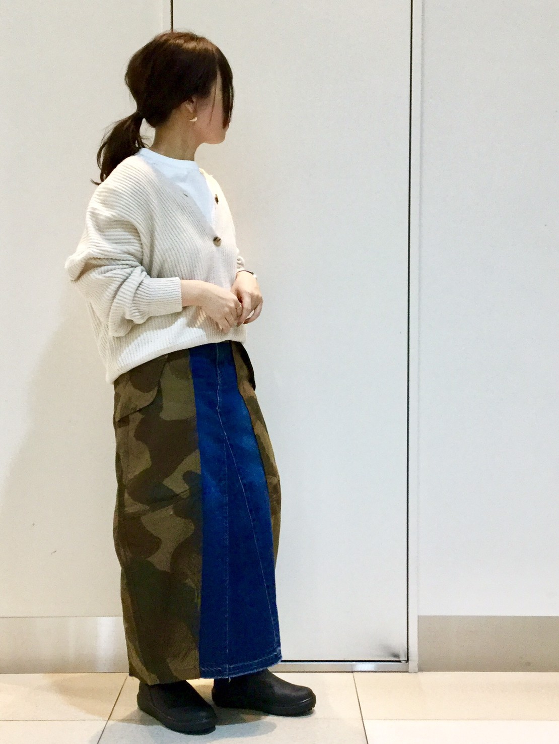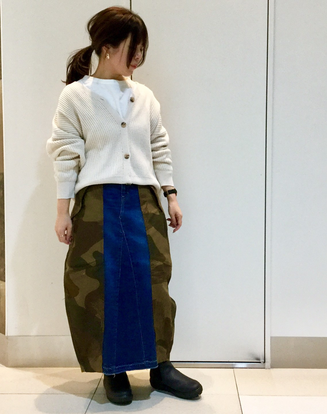 ミリタリー感があるスカートにはアイボリーをチョイスして優しい雰囲気に。