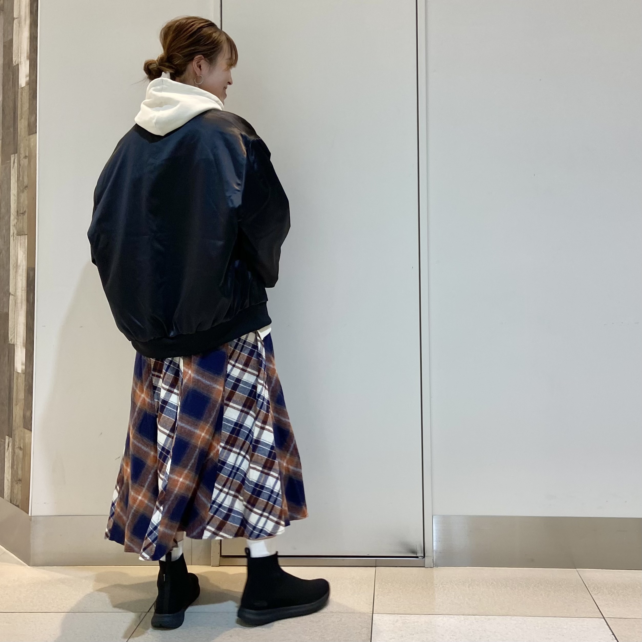 パーカー×スカートスタイルにあえてスポーティなブルゾンをさっと羽織る、ミックススタイルが新鮮!