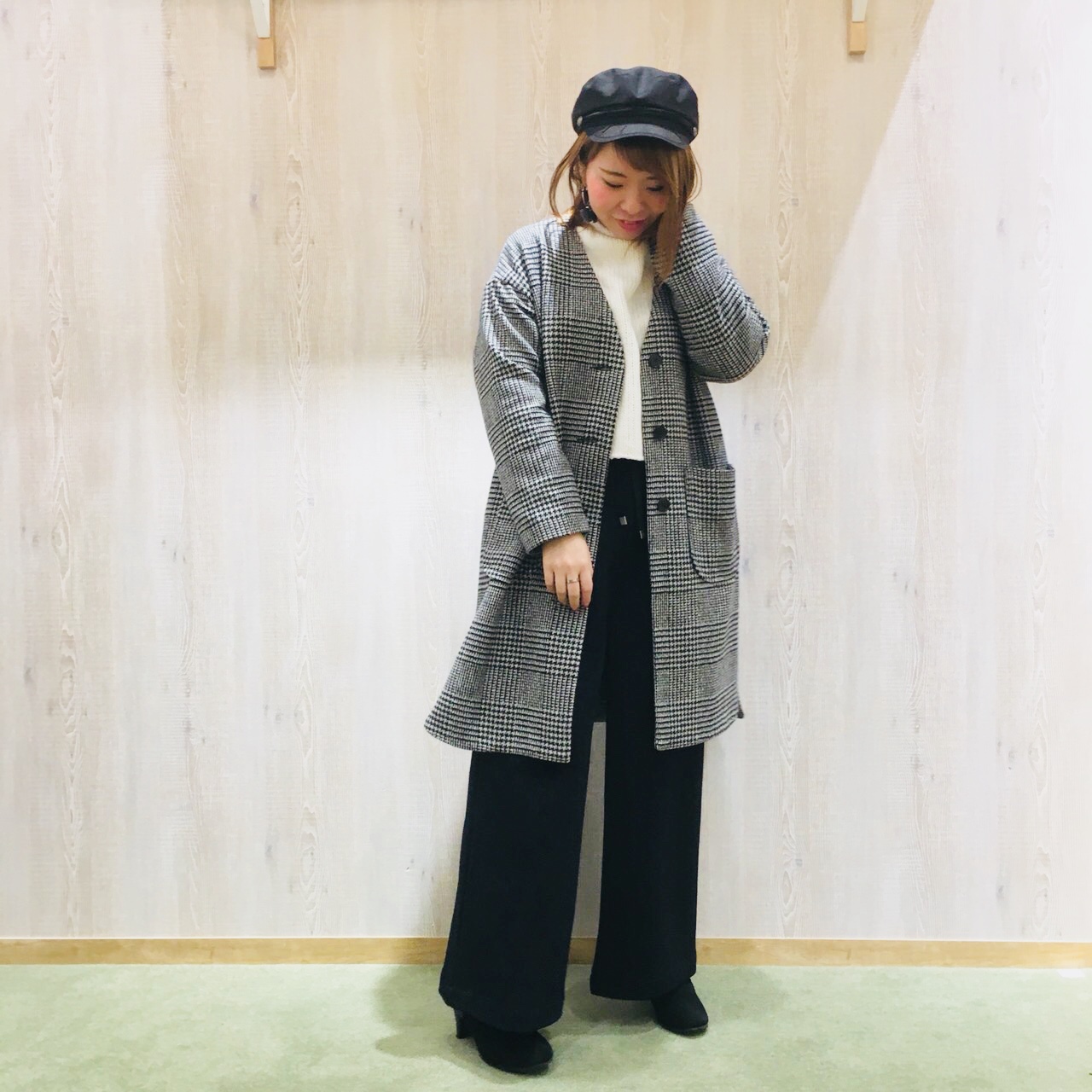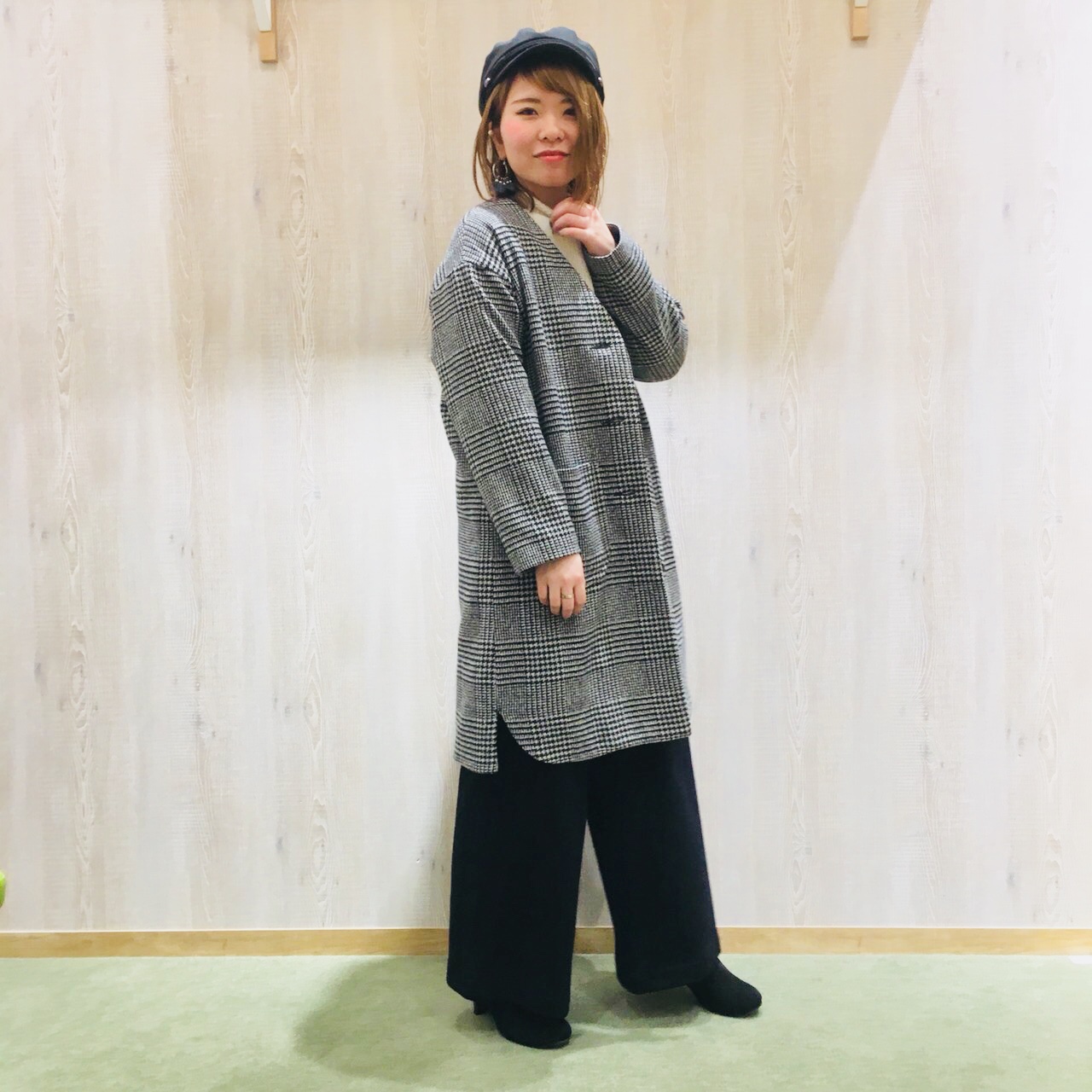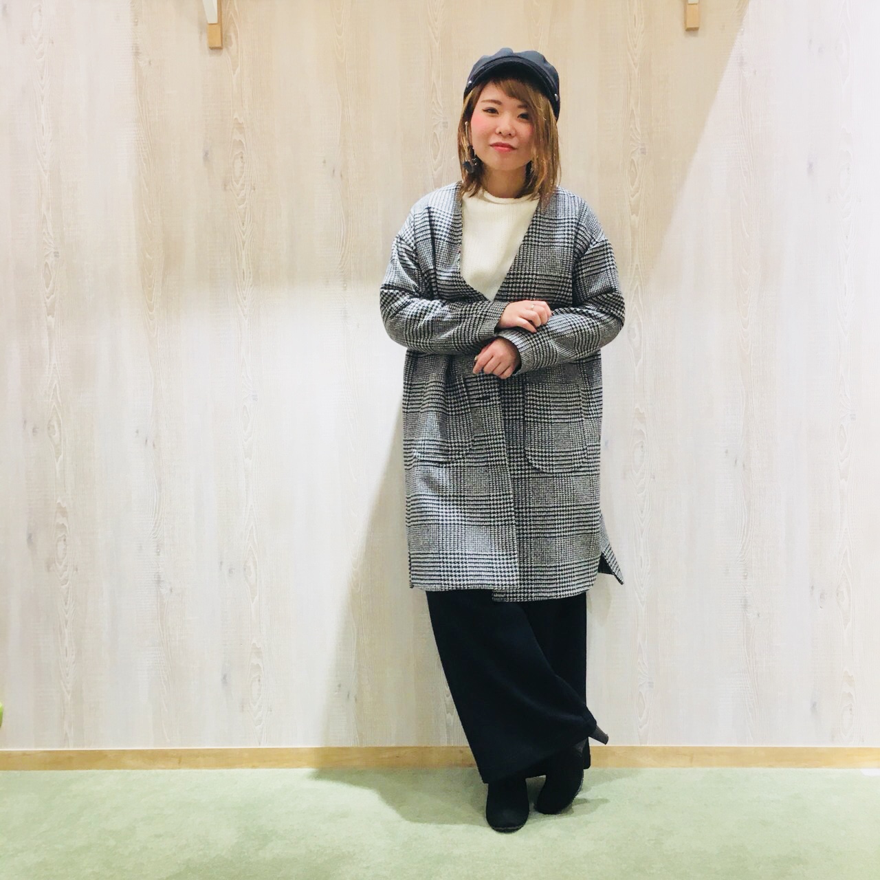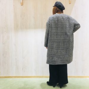 アウターは千鳥格子のものをセレクト
