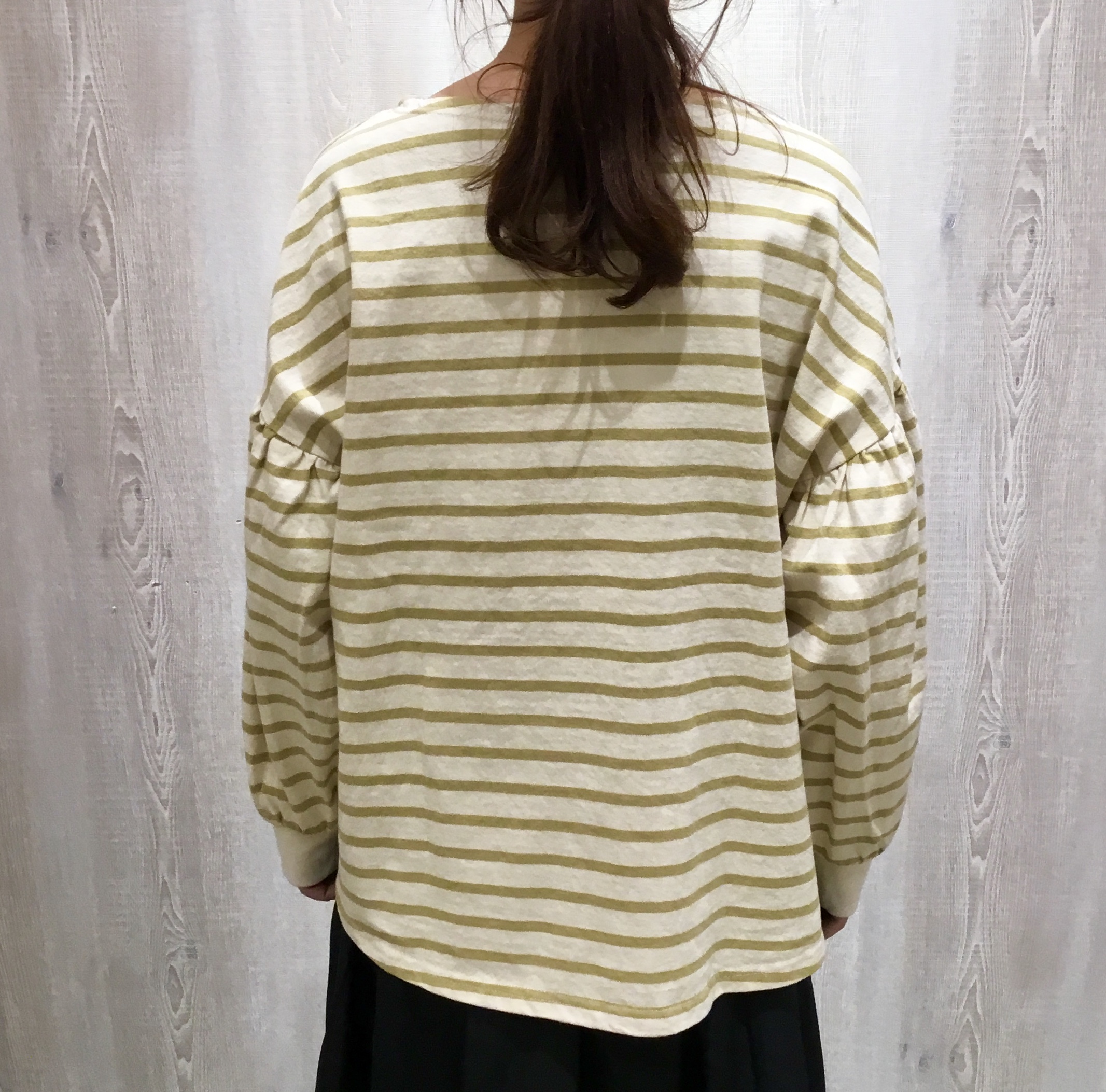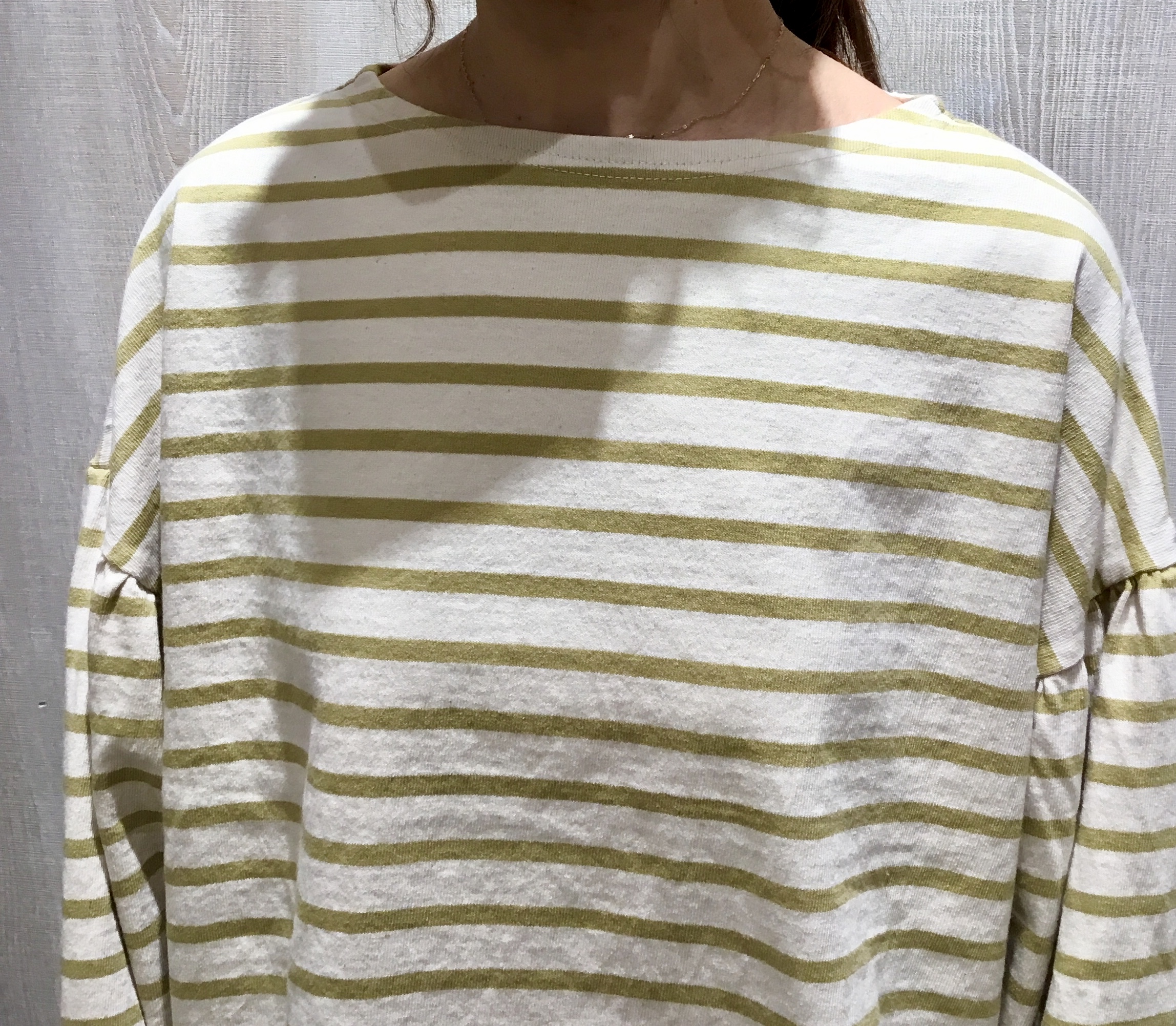 細めのボーダーは子供ぽくならず、お袖も絶妙なボリューム感で実は甘さ控えめ。
